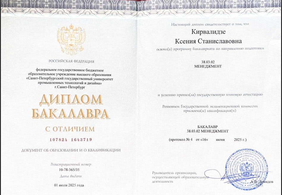 - Образование: Санкт-Петербургский Государственный Университет Промышленных Технологий и Дизайна, менеджмент, бакалавр, диплом с отличием, 2025 год.