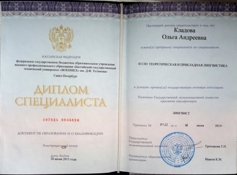 - Образование: БГТУ, теоретическая и прикладная лингвистика, лингвист, 2015 год.