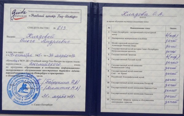 Изучаю английский язык с 1996 года. Окончила: курс изучения английского языка в 2009 году с дипломом advanced, курс фонетики английского языка в 2014 году, университет по специальности "лингвист" в 2015 году. По совместительству работаю преподавателем на курсах английского языка, а также гидом-переводчиком с 2016 года.