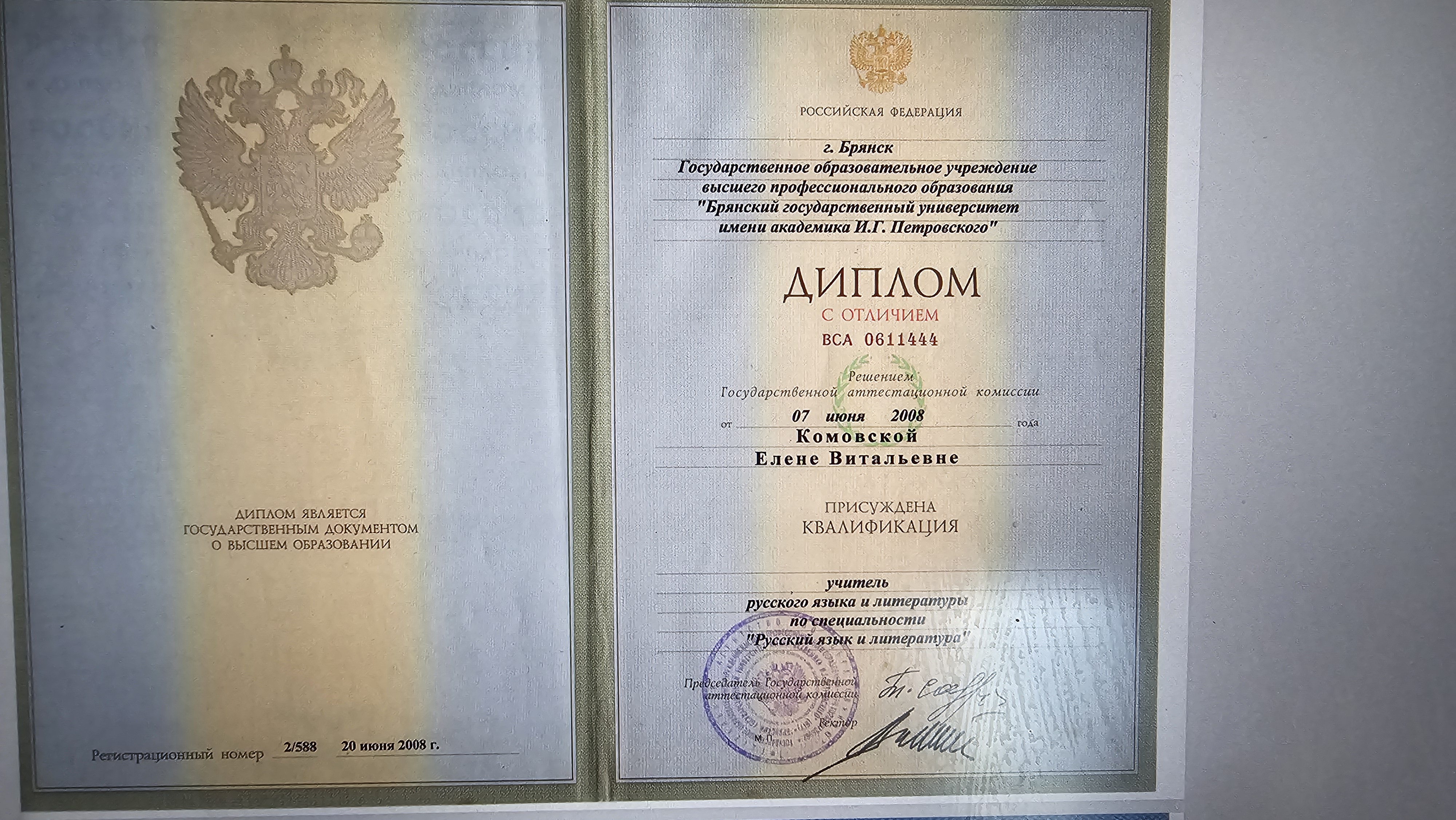 Образование: Брянский Государственный Университет имени академика И. Г. Петровского, "Учитель русского языка и литературы", специалист, 2008 год.