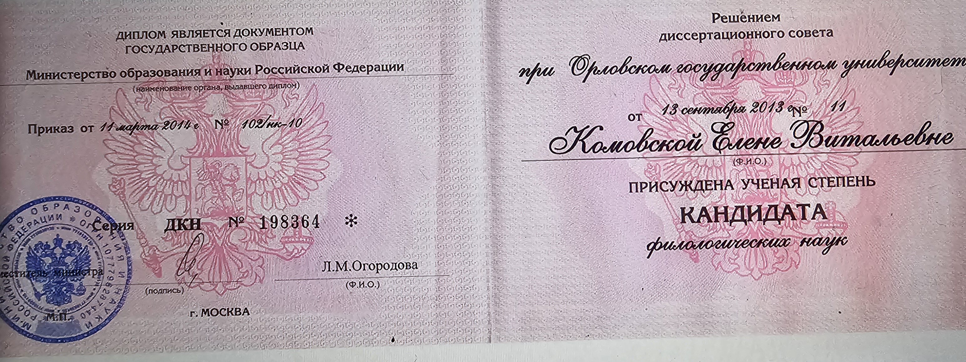 Кандидат филологических наук, 2013 год.
