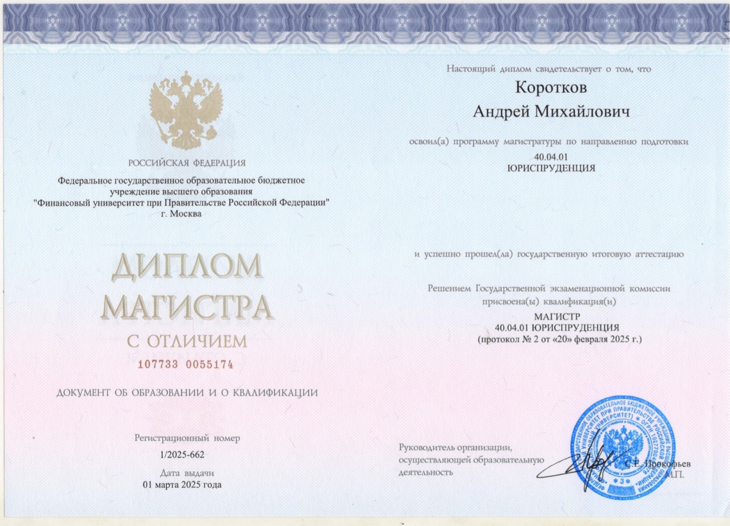 Образование: Калужский Институт (филиал) Всероссийского Государственного Университета Юстиции, Юриспруденция, 2022.