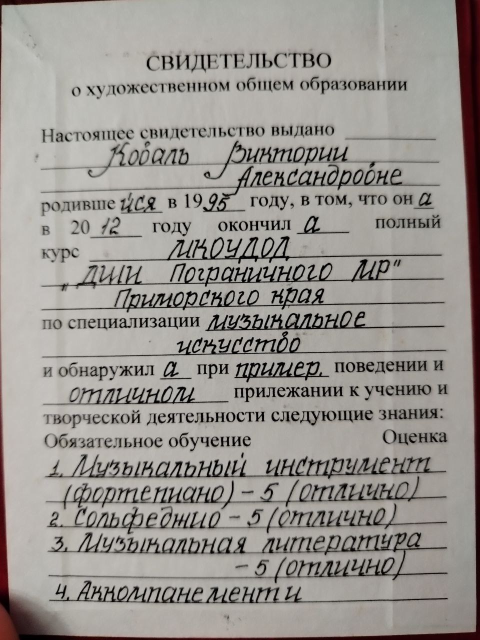 У меня общее художественное образование с отличием по музыкальному искусству (хор, сольфеджио, фортепиано, вокал) (есть диплом), и высшее образование с отличием по психологии....