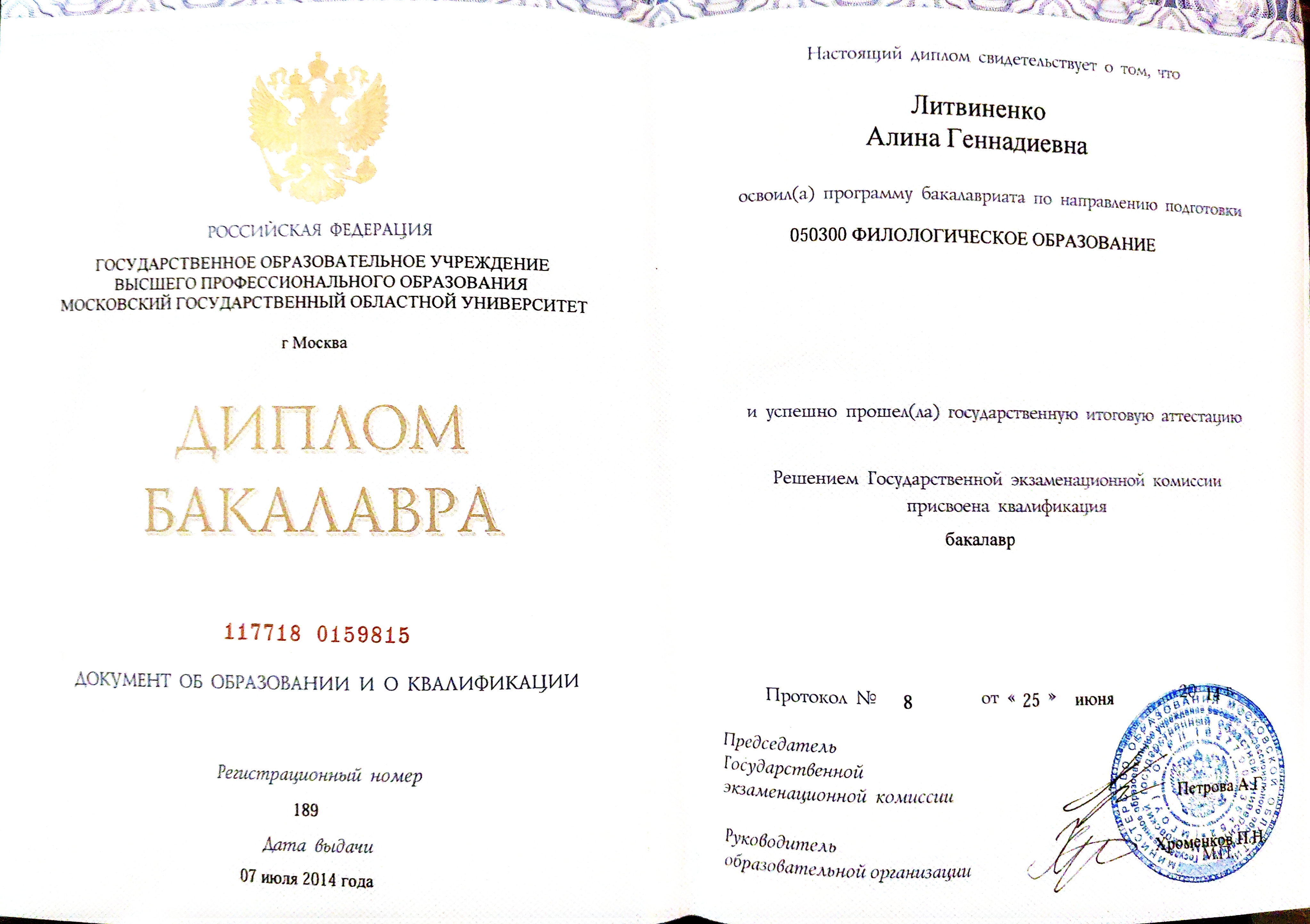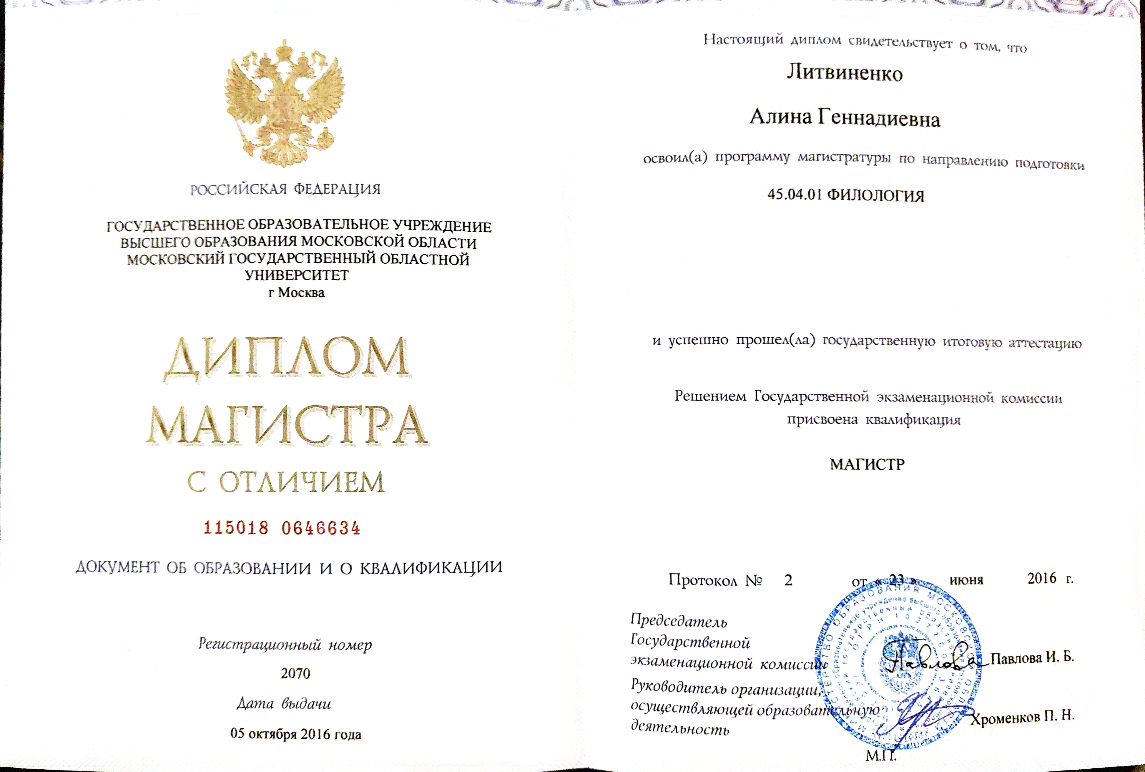 - Образование: Московский Государственный Областной Университет (МГОУМ), филолог (бакалавр, 2014 год, магистр (диплом с отличием)) 2016 год.