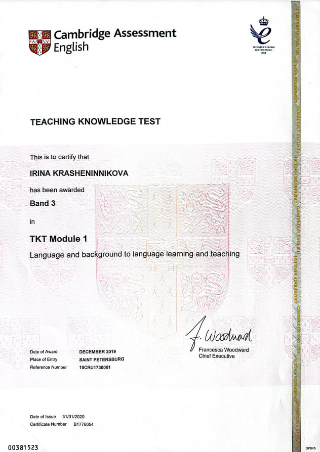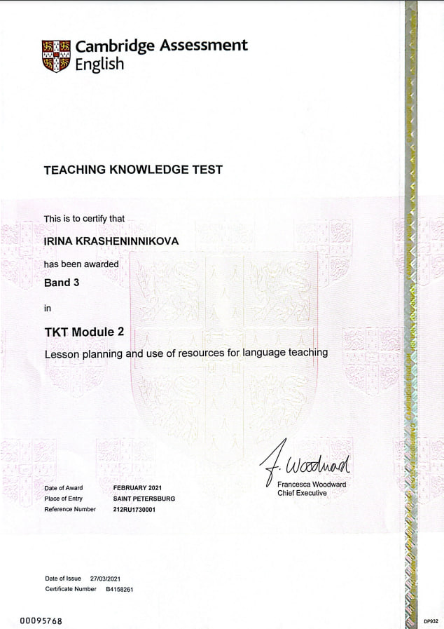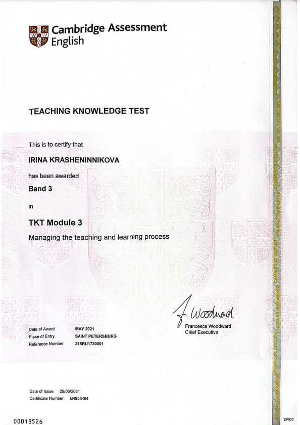 Дополнительная информация: В 2007 и 2008 годах участвовала в программе "Work and Travel USA". Владею сертификатами TKT Modules 1, 2, 3.