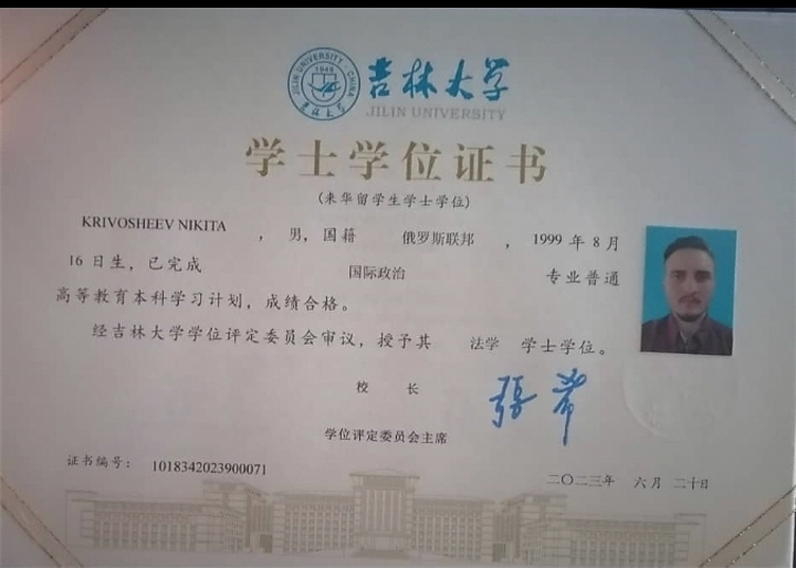 - Образование: Jilin University (Китай), специальность "Международная политика и право", бакалавр, 2023 год.