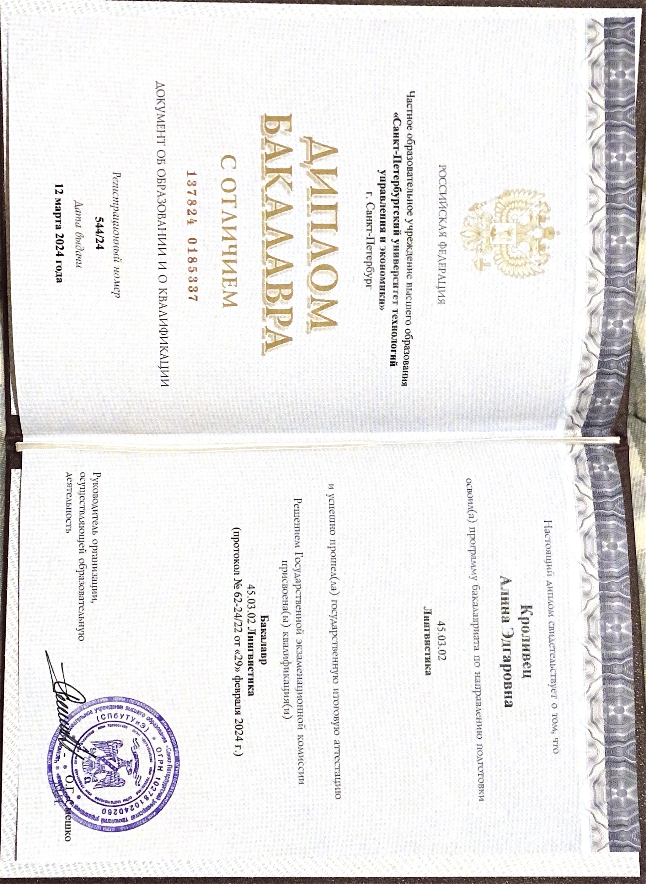 - Образование: Санкт-Петербургский Университет Технологий Управления и Экономики, "Лингвистика (перевод и переводоведение)", бакалавр, диплом с отличием, 2024 год.