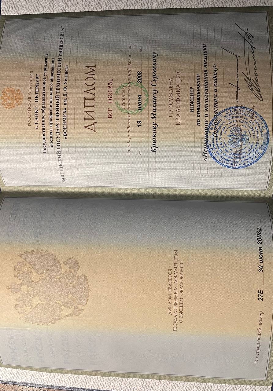 - Образование: БГТУ "ВОЕНМЕХ", инженер, специалист, 2008 год.