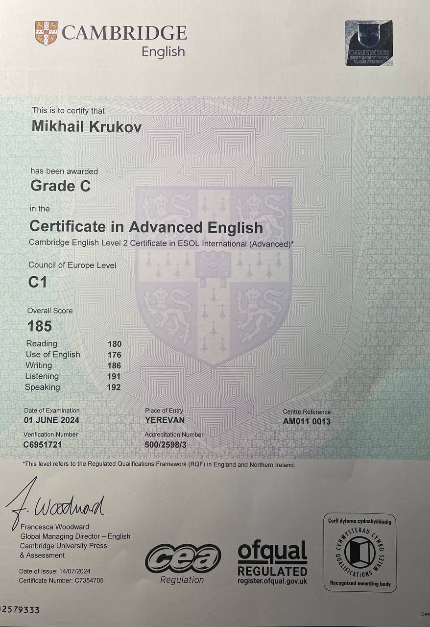 Высшая квалификационная категория. 3-е место на международной научно-практической конференции. Публикация научной статьи в сборнике материалов конференции. Свободно владею английским языком, веду свой образовательный канал.