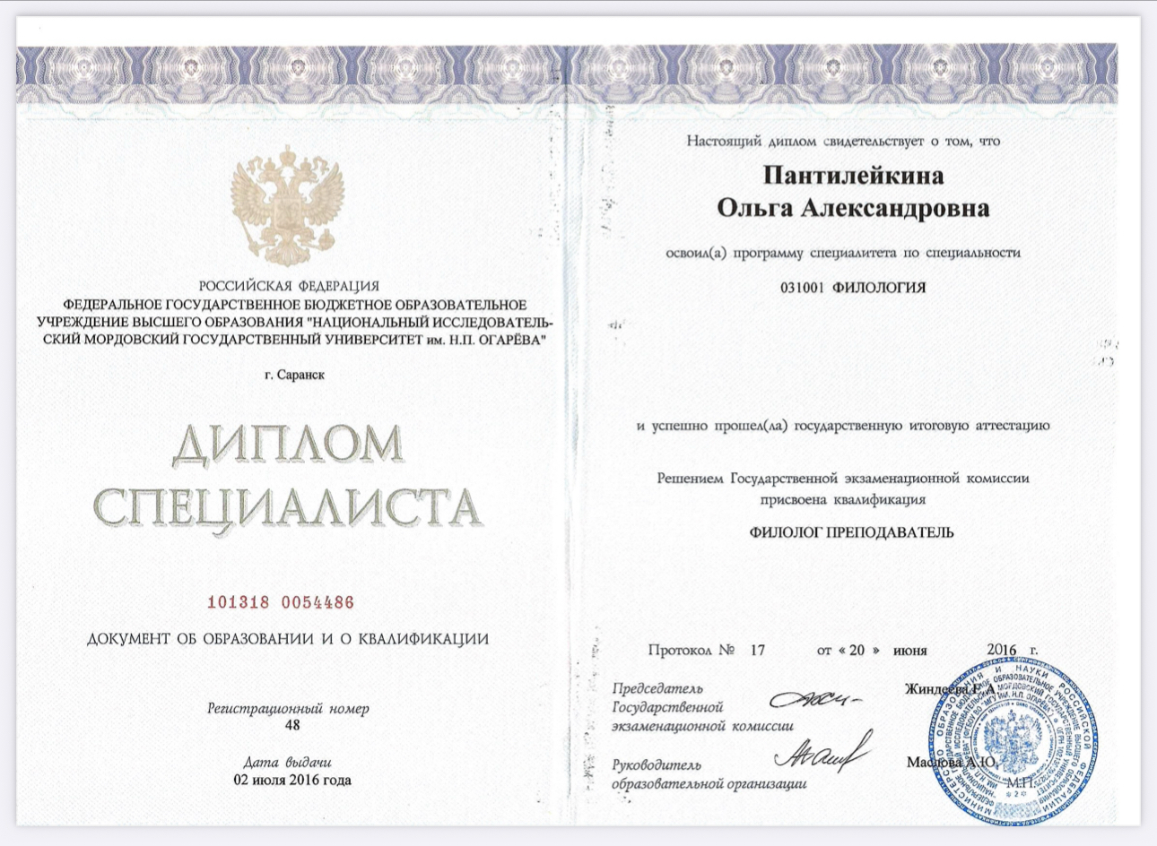 - Образование: Высшее, Мордовский Государственный Университет имени Н. П. Огарёва, "Филолог- преподаватель", специалист, 2016 год.