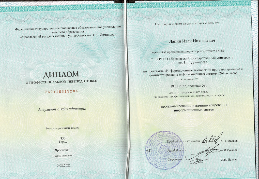 Диплом о профессиональной переподготовке, "Информационные технологии: программирование и администрирование информационных систем", 2022 год.