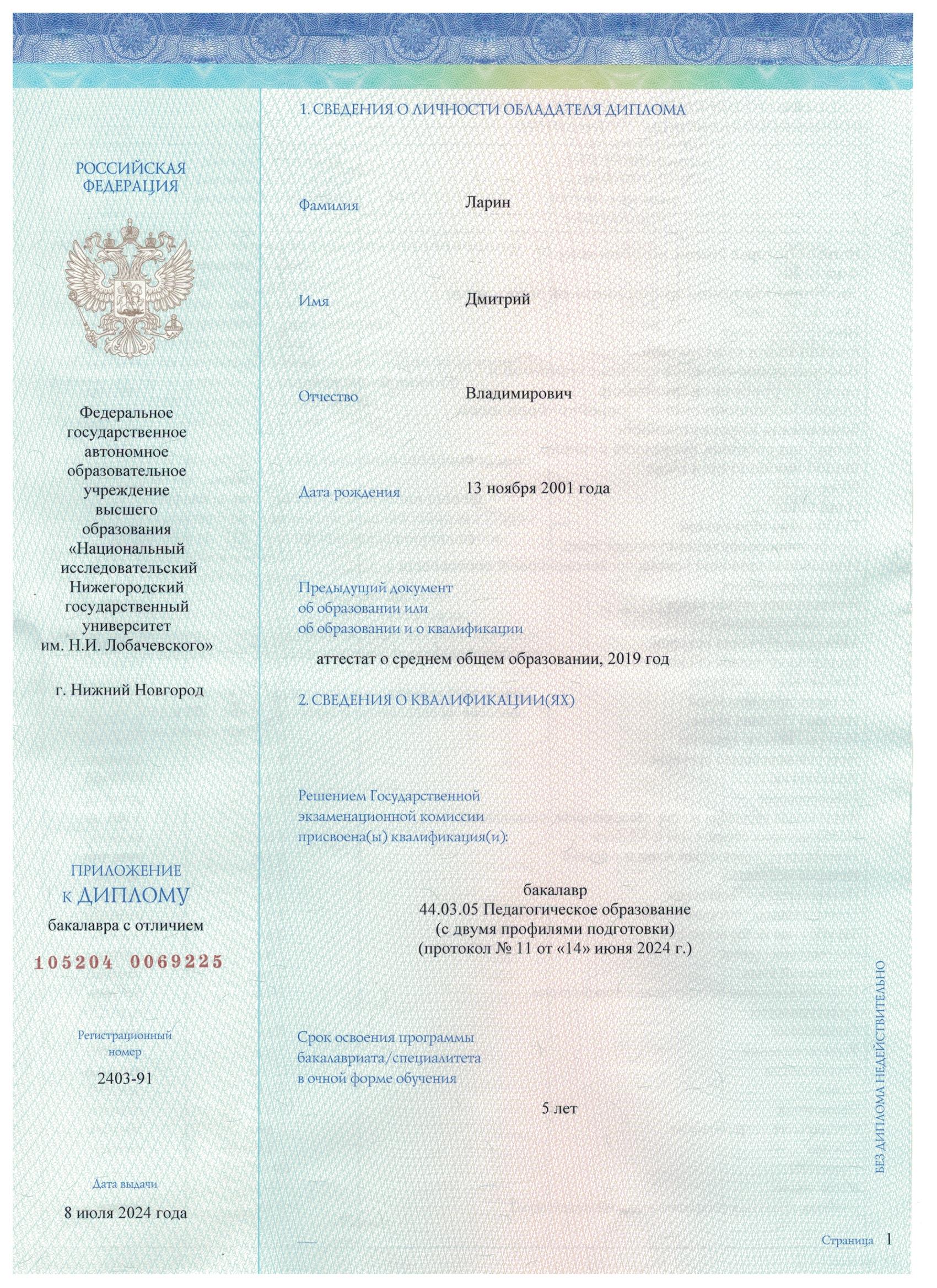 - Образование: Нижегородский Государственный Университет имени Н. И. Лобачевского, педагогическое образование с двумя профилями подготовки (история и обществознание), бакалавр, 2024 год.