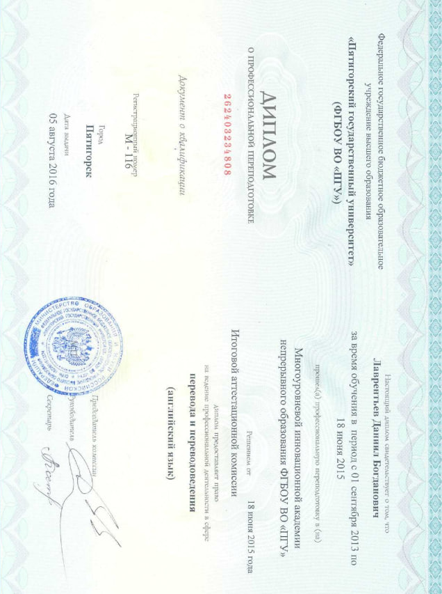 Также имею диплом о профессиональной переподготовке от ФГБОУ ВО МИАНО "Пятигорский Государственный Университет", специальность "Перевод и переводоведение", 2016 год.