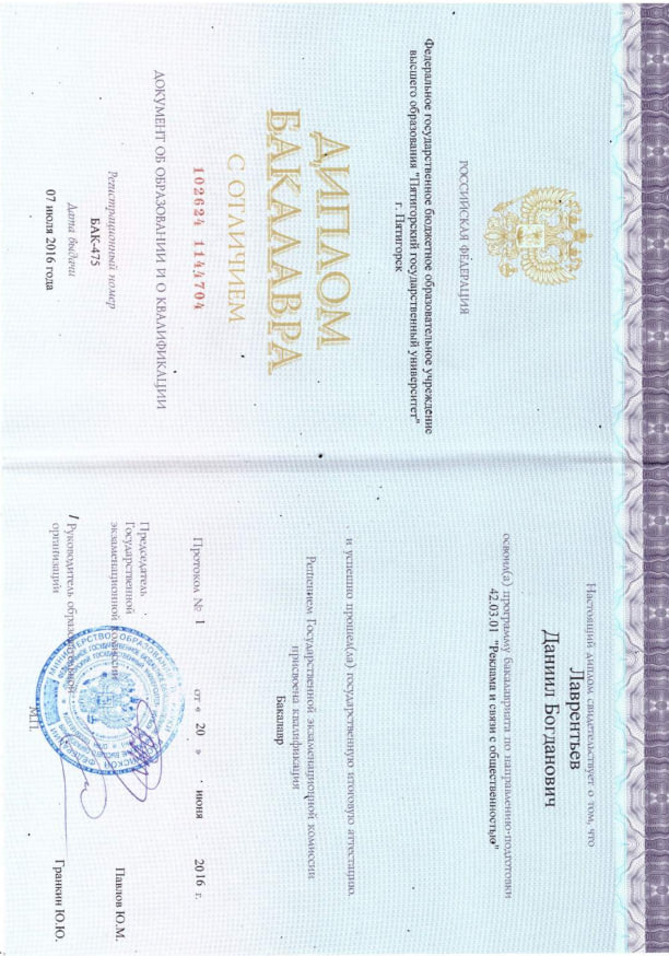 Образование: Окончил ФГБОУ ВО "Пятигорский Государственный Университет", специальность "Реклама и связи с общественностью", бакалавр, 2016 год.