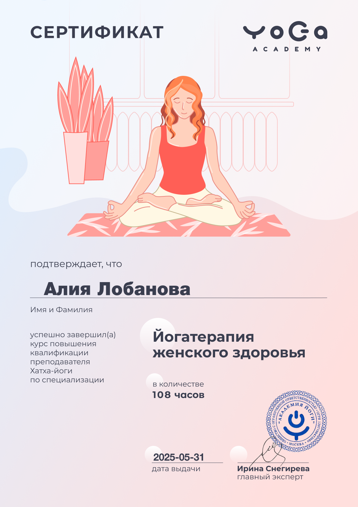 Я сертифицированный преподаватель хатха-йоги и йоготерапии женского здоровья.