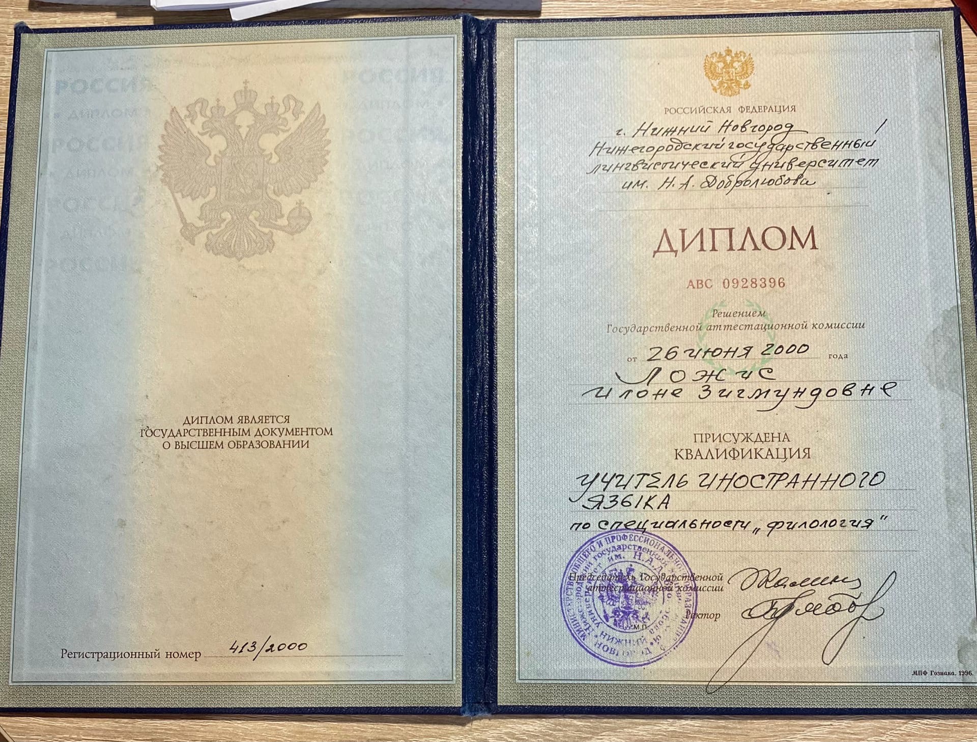 - Образование: Нижегородский Государственный Лингвистический Университет имени Добролюбова, факультет филологии, "Учитель иностранного языка", специалист, 2000 год.