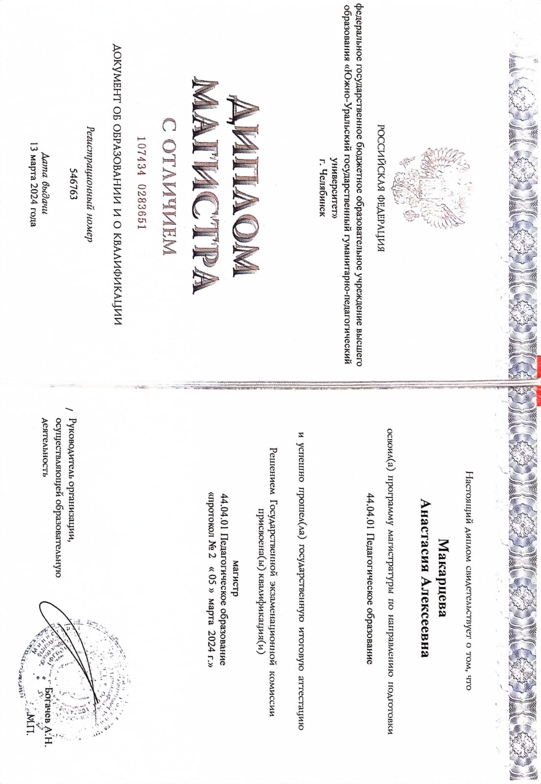 Южно-Уральский Государственный Гуманитарно-Педагогический Университет, математическое образование в системе профильной подготовки, магистр, 2024 год.