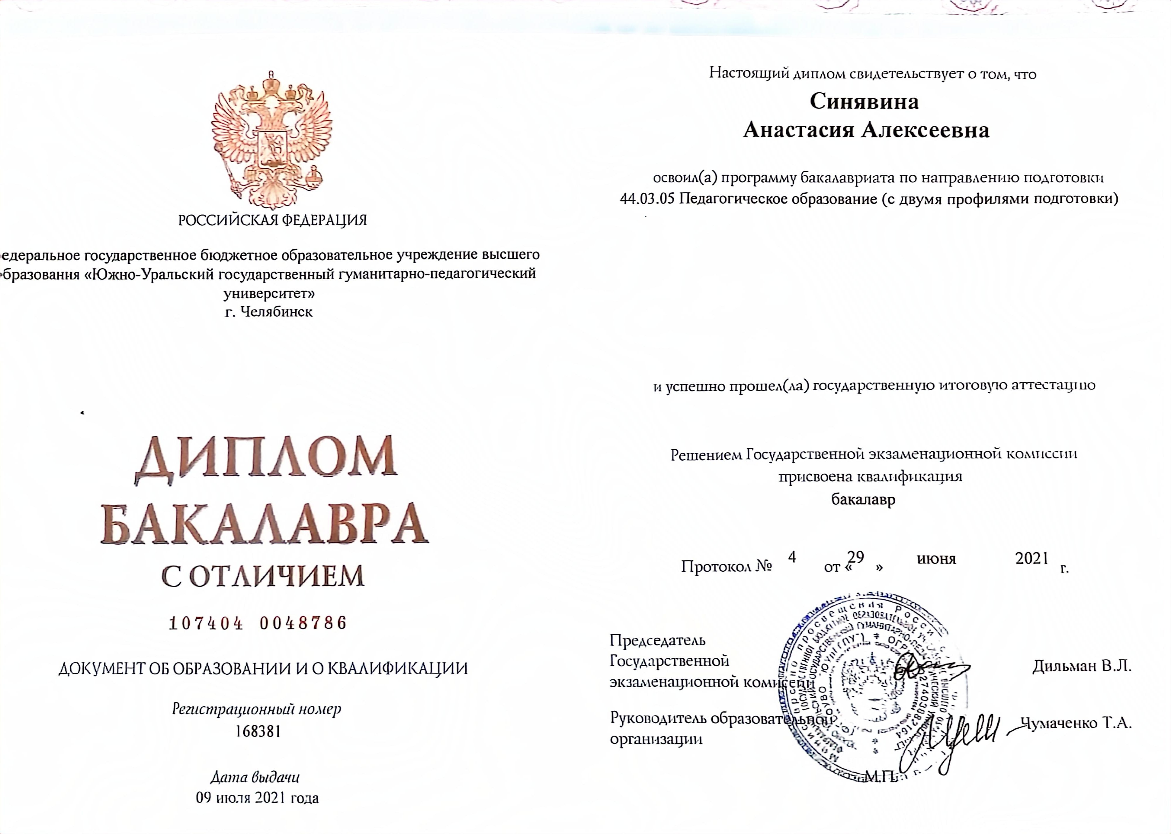 Образование: Южно-Уральский Государственный Гуманитарно-Педагогический Университет, педагогическое направление с двумя профилями подготовки (математика, экономика), бакалавр, 2021 год.