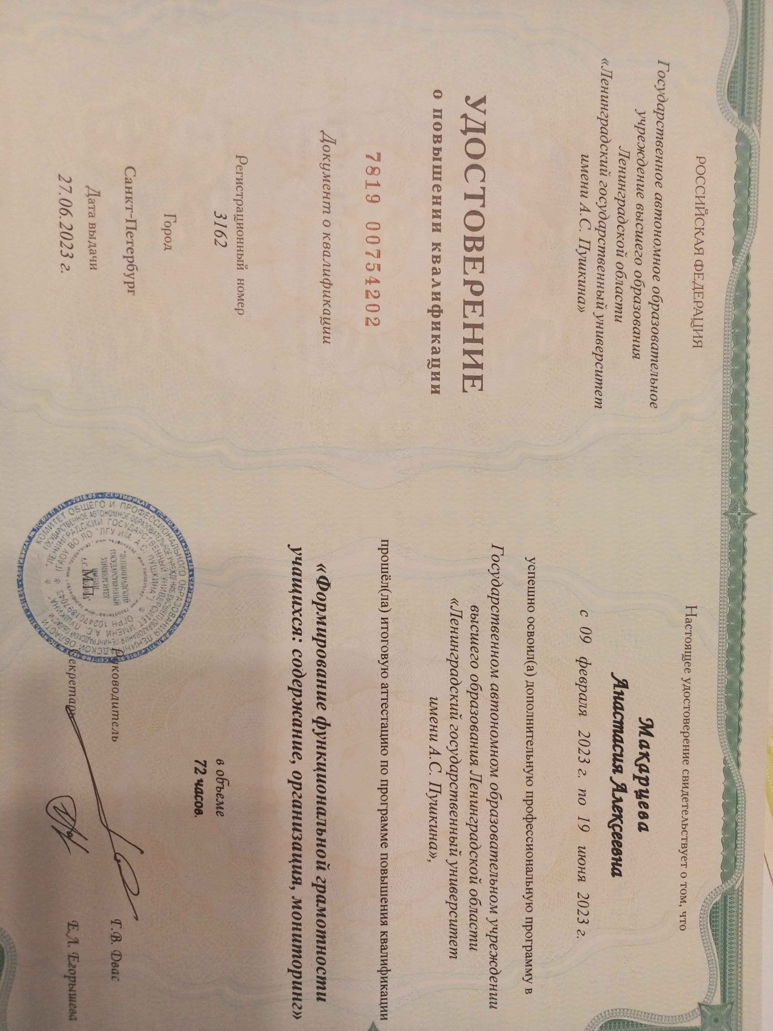 Курсы повышения квалификации: "Эффективные технологии обучения и воспитания в современной школе" (2021 год). "Школа современного учителя: Развитие математической грамотности" (2022 год). "Оценивание ответов на задания ВПР, математика, 5-8 классы" (2023 год). "Формирование функциональной грамотности учащихся: содержание, организация мониторинг" (2023 год)....