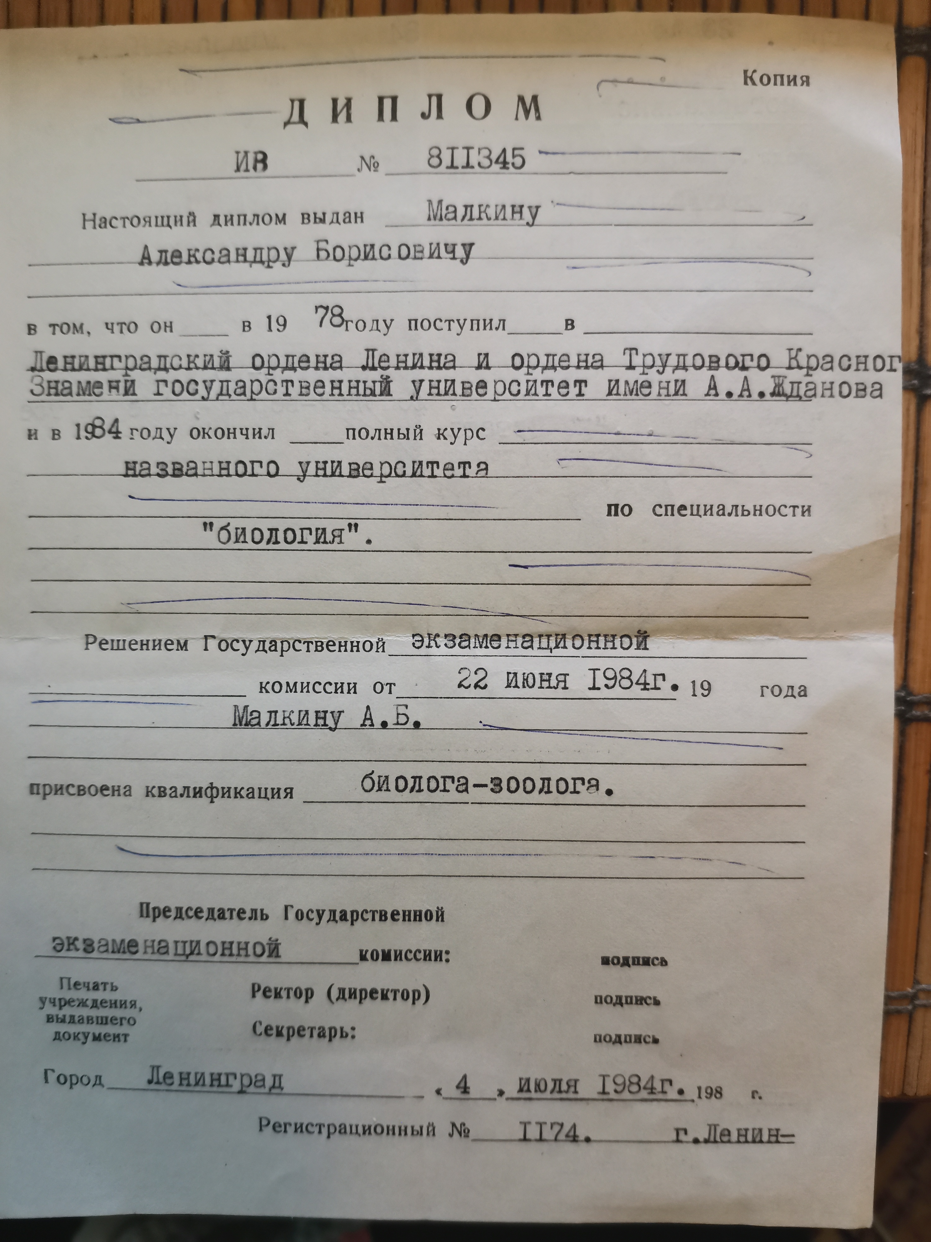 - Образование: Высшее, Ленинградский ордена Ленина Государственный Университет имени А. А. Жданова, биолог-зоолог, специалист, 1984 год.