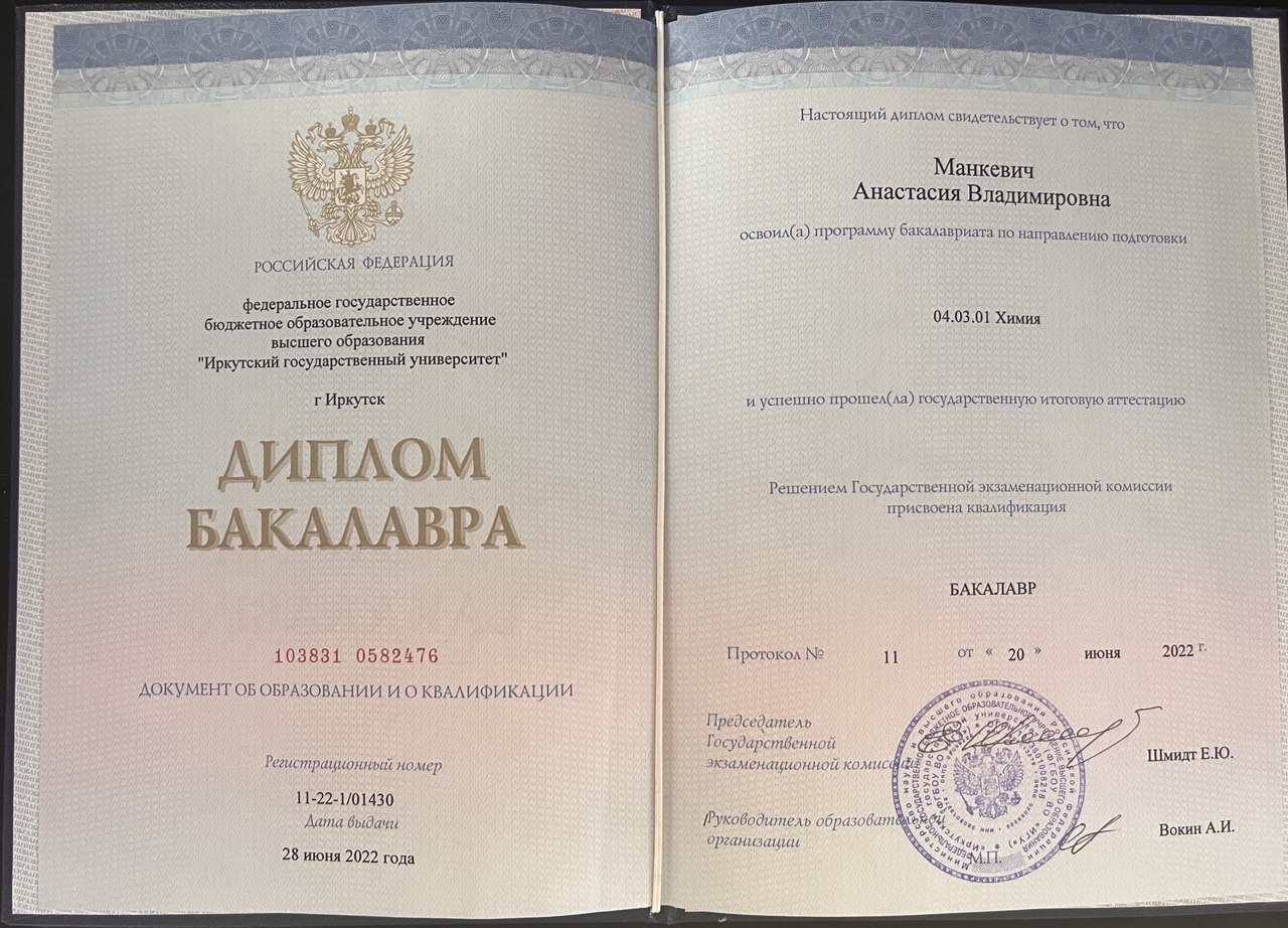 - Образование: Иркутский Государственный Университет, "Химия", бакалавр, 2022 год.