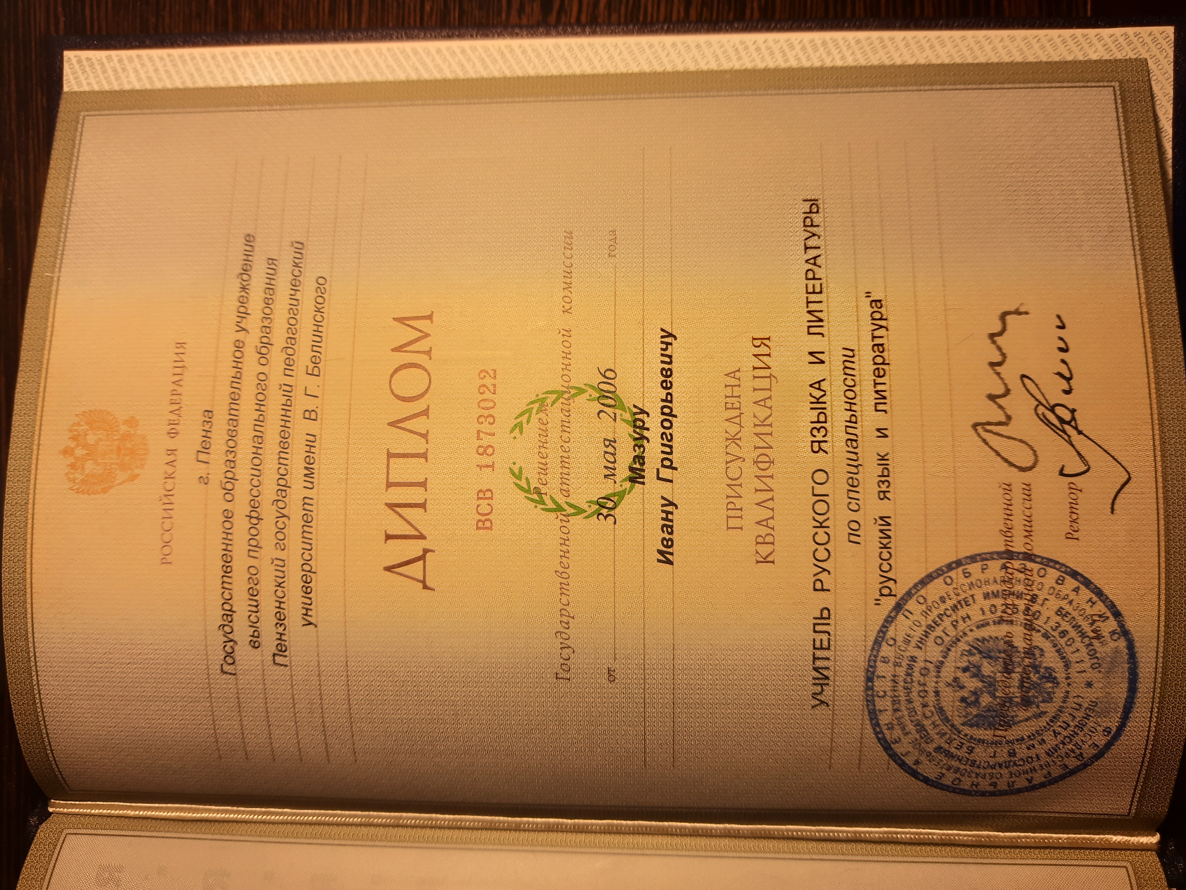 Образование: Высшее, Пензенский Педагогический Университет имени В. Г. Белинского, специальность "Учитель русского языка и литературы", специалист, 2006 год.
