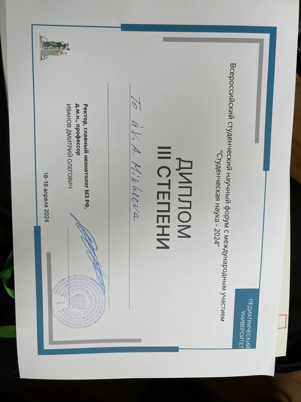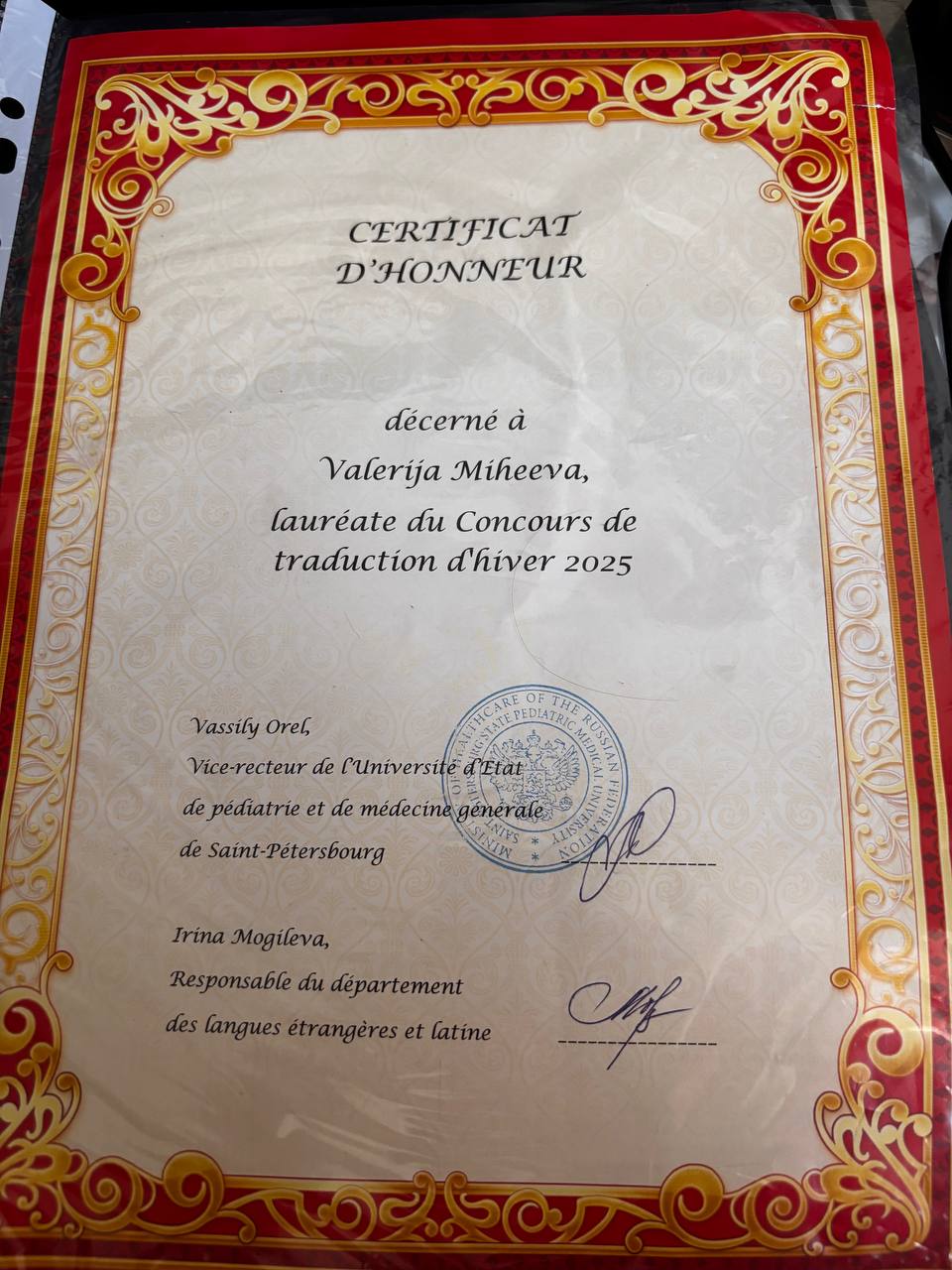 Образование: Окончила школу с углублённым изучением французского языка, имею общее образование (11 классов), 2023 год. А также высшее СПБГПМУ