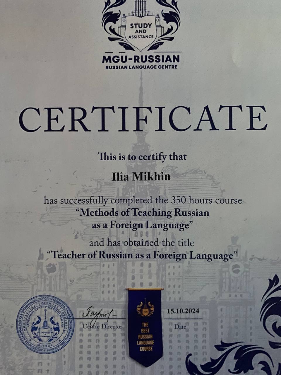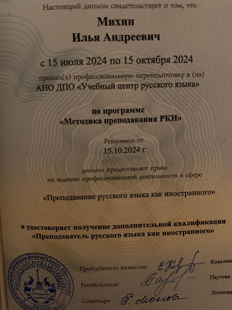 Дополнительная информация: Преподаю Английский язык с 2011 года. Опыт работы с детьми и взрослыми. Есть опыт работы за рубежом (Китай). Преподаю русский язык для иностранцев с 2024 года.