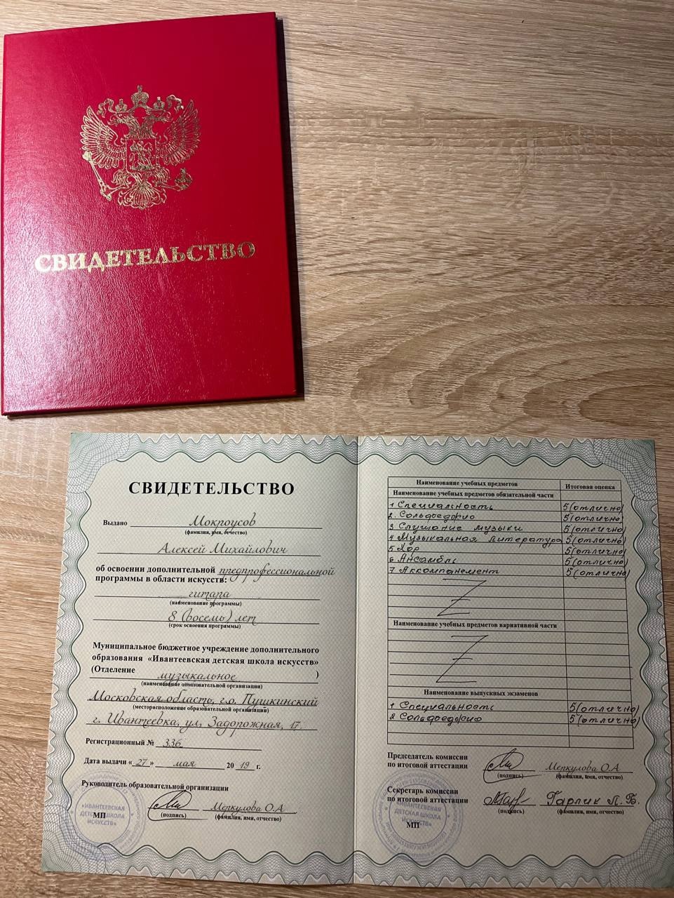 Образование: Ивантеевская Детская Школа Искусств, гитара, 2019 год.