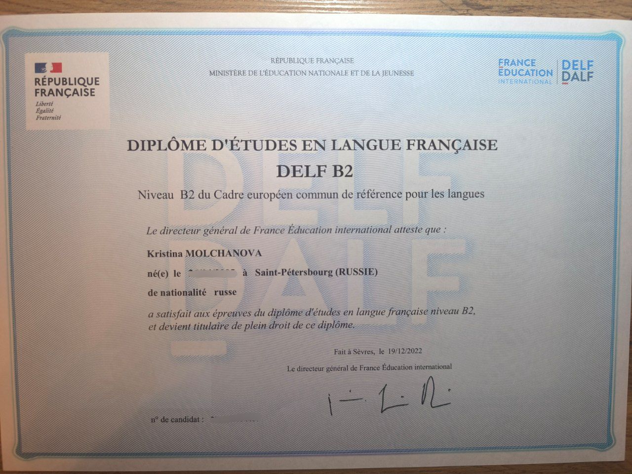 Дополнительная информация: Подтверждённый уровень DELF В2.