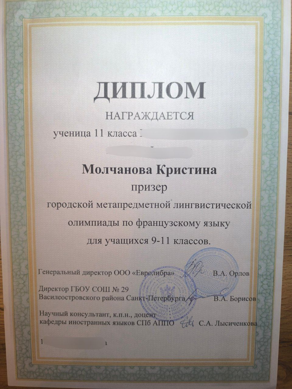 - Образование: РГПУ имени Герцена, педагогическое образование в области иностранного языка (французский язык), 3 курс бакалавриата.