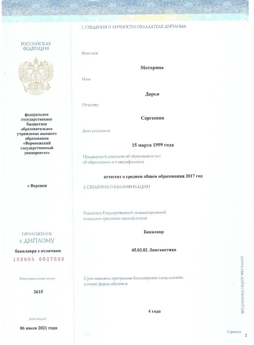 - Образование: Воронежский Государственный Университет, "Лингвистика", бакалавр, красный диплом, 2021 год.