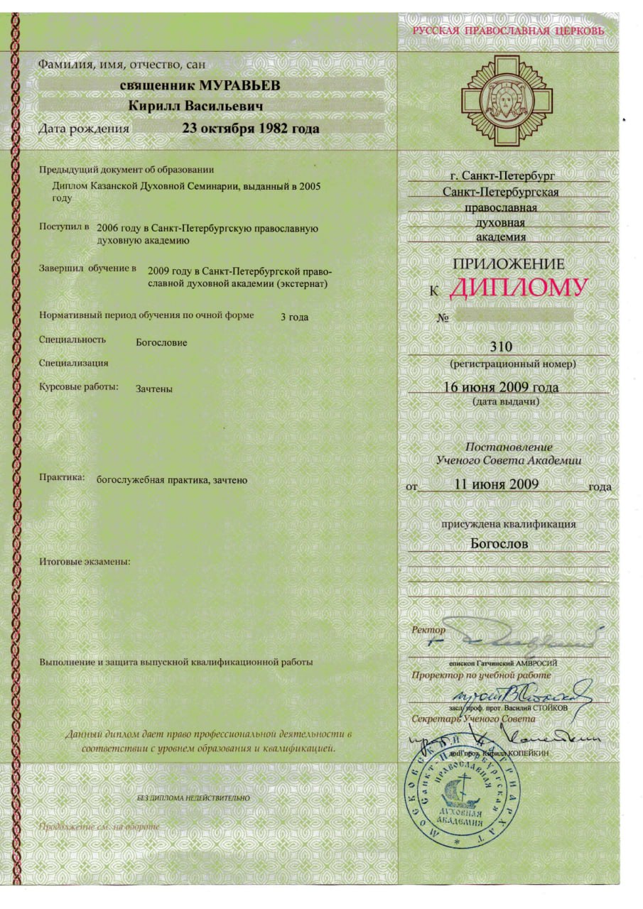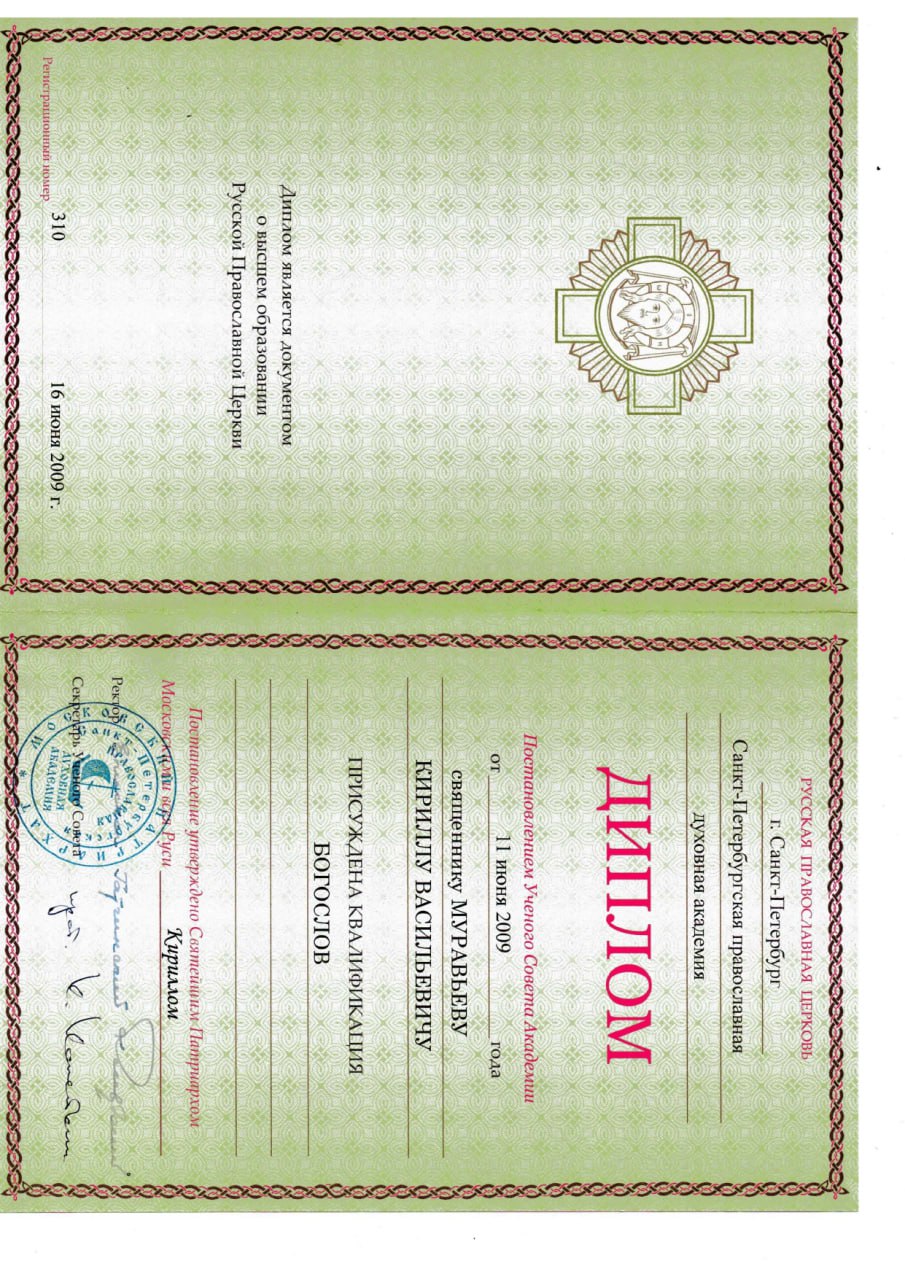 - Образование: Санкт-Петербургская Православная Духовная Академия, богослов, 2009 год.