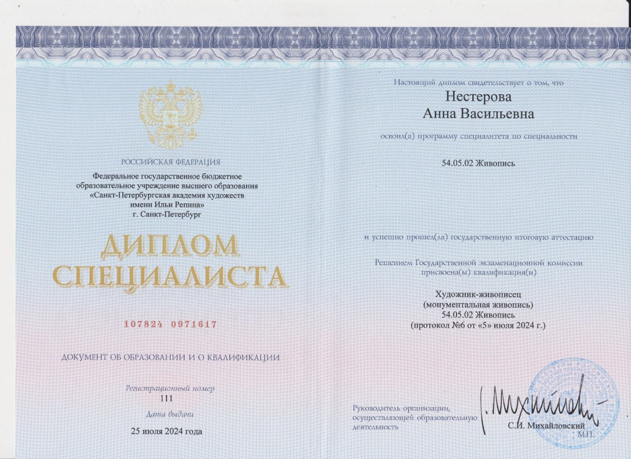 - Образование: Высшее, Академия художеств имени Ильи Репина, художник-живописец (монументальная живопись), специалист, 2024 год.