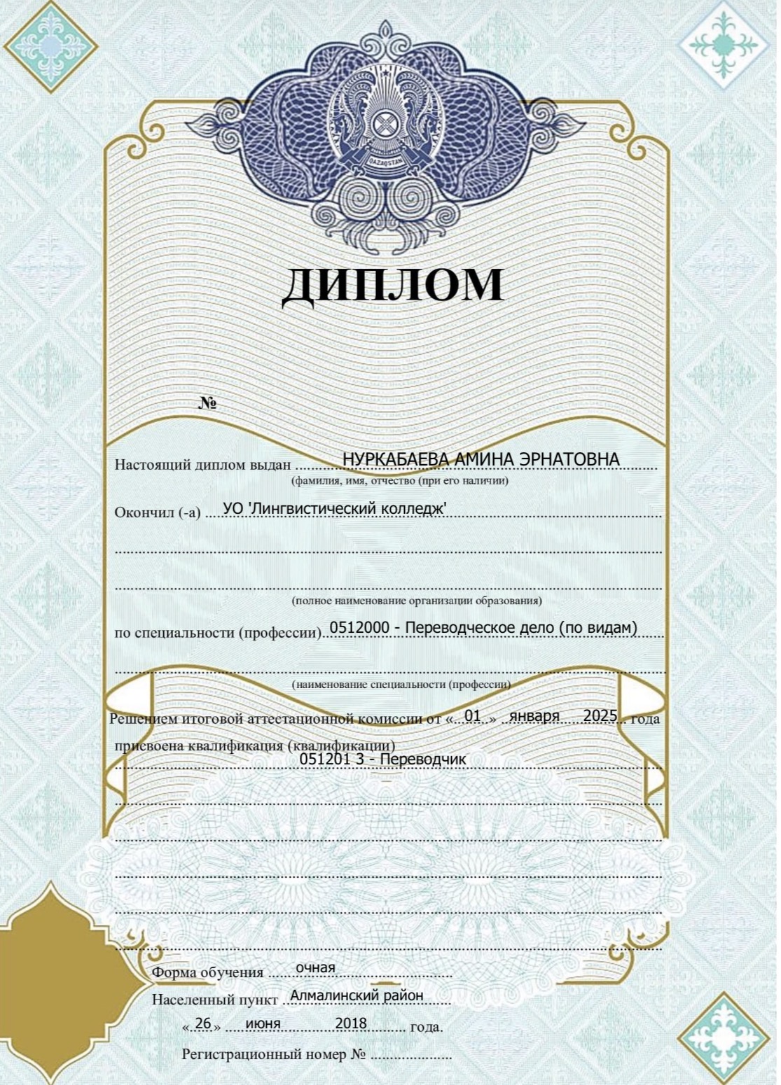 - Образование: Лингвистический Колледж при университете «КазУМОиМЯ имени Абылай хана», факультет «Переводческое дело», диплом с отличием, 2018 год.