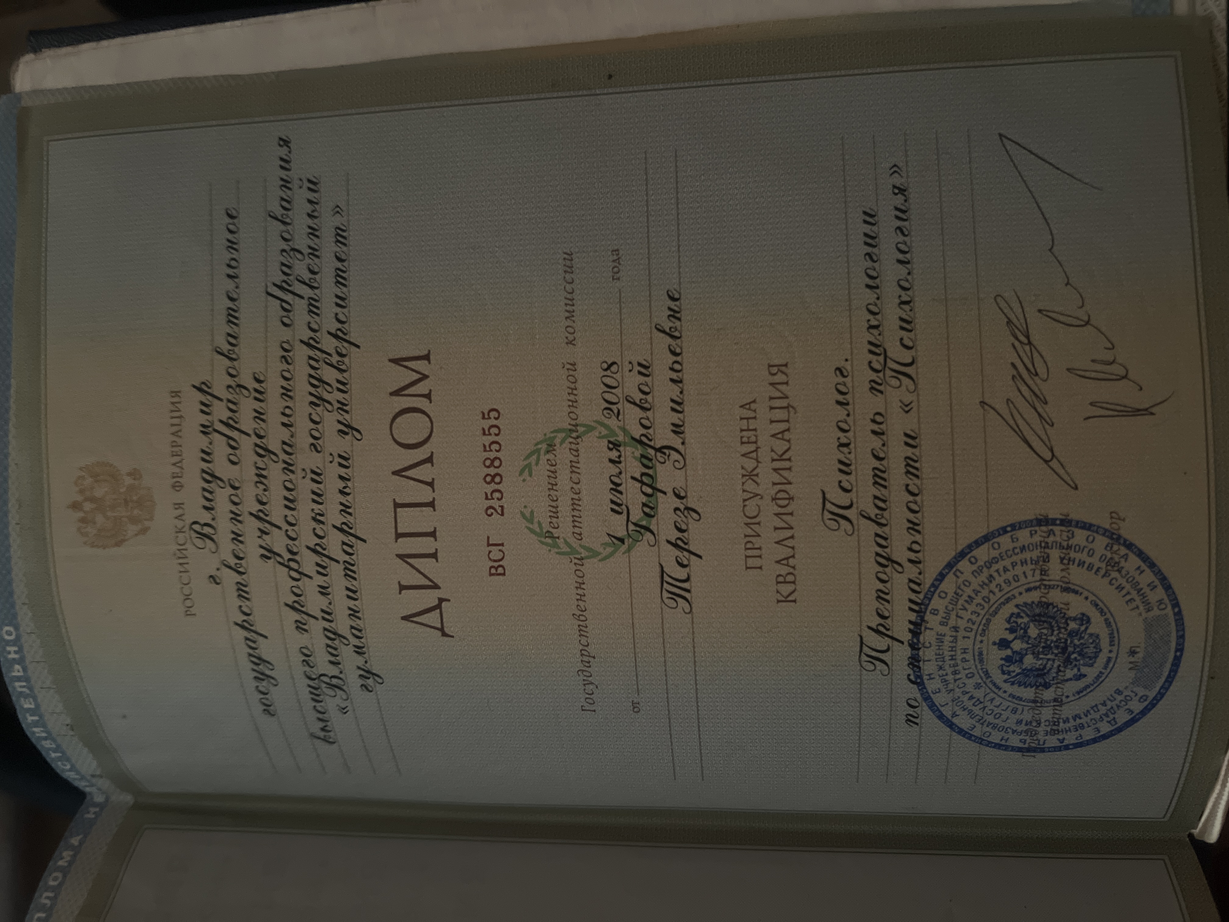 - Образование: Высшее очное образование, Владимирский Государственный Гуманитарный Университет, "Педагог-психолог", специалист, 2008 год.