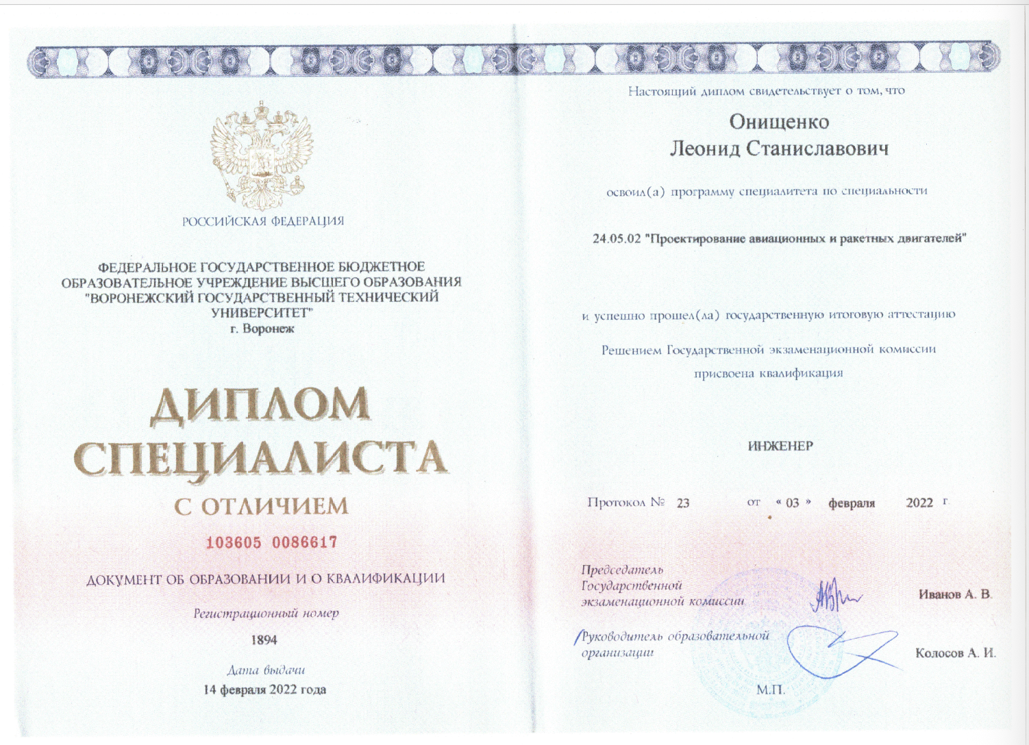 Образование: Высшее, Воронежский Государственный Технический Университет, проектирования авиационных и ракетных двигателей, инженер, диплом с отличием, специалист, 2022 год.