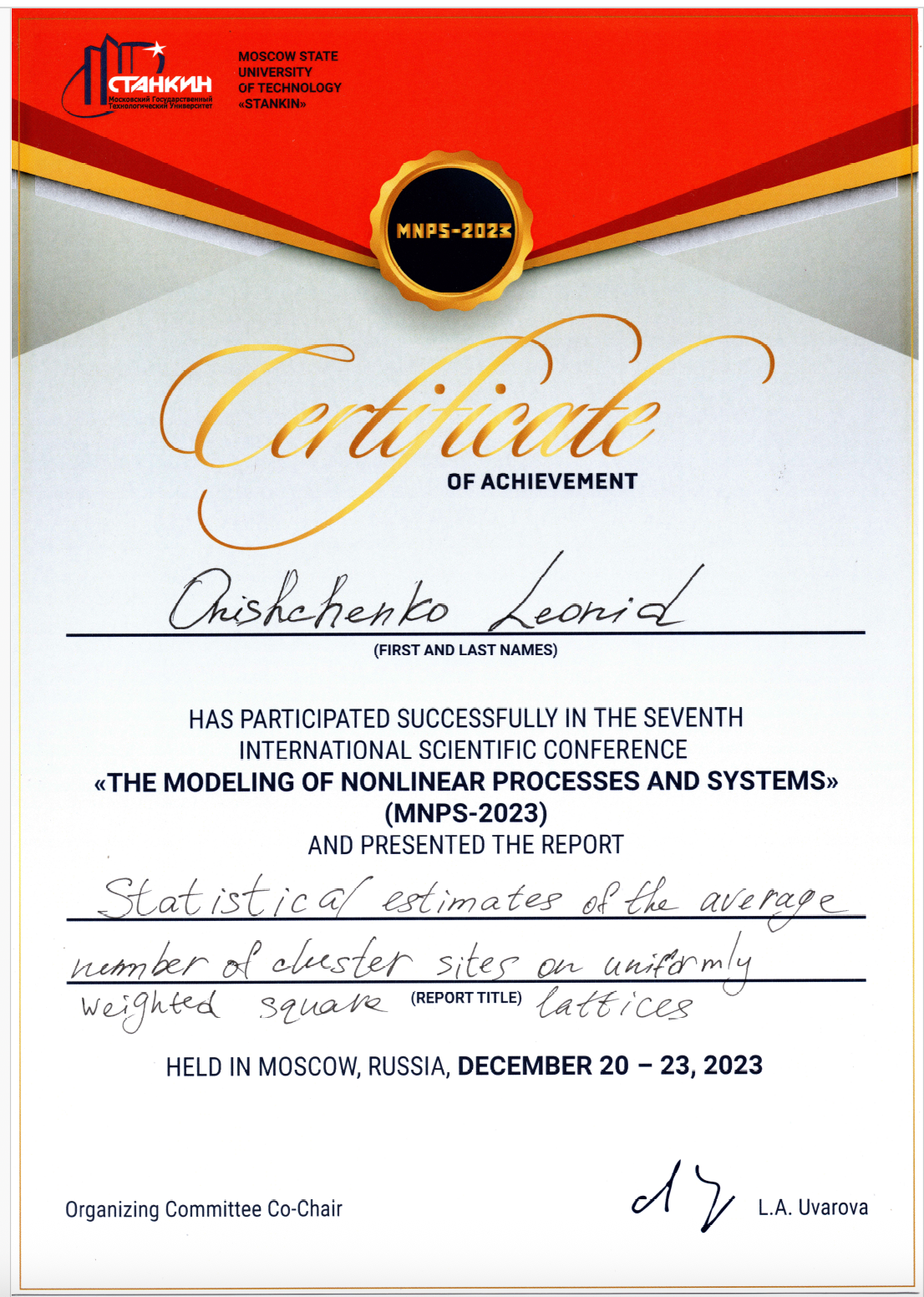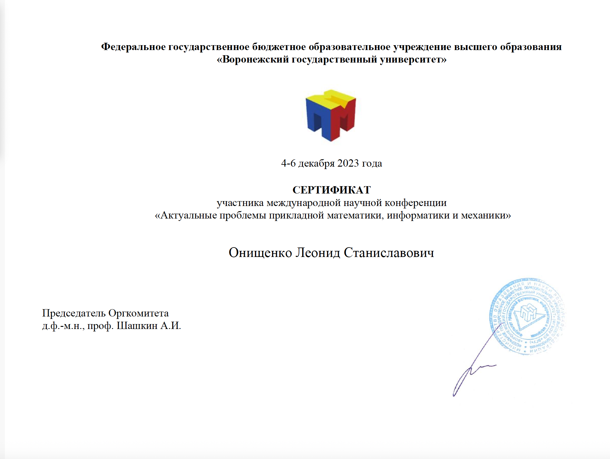 Принимал участие в общероссийском семинаре «Информатика, управление и системный анализ (ИУиСА-84)» в МГУ, выступал на международной научной конференции «Актуальные проблемы прикладной математики, информатики и механики (АППМИМ-2023)», принимал участие в VII Международной научной конференции «Моделирование нелинейных процессов и систем (MNPS-2023)» «СТАНКИН».