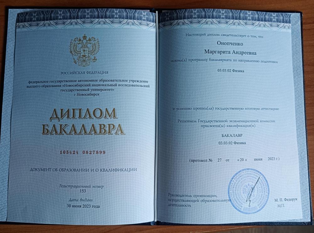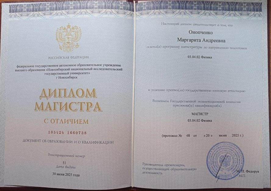 Образование: Новосибирский Национальный Исследовательский Государственный Университет, "Физика" (бакалавр 2023 год, магистр 2025 год).