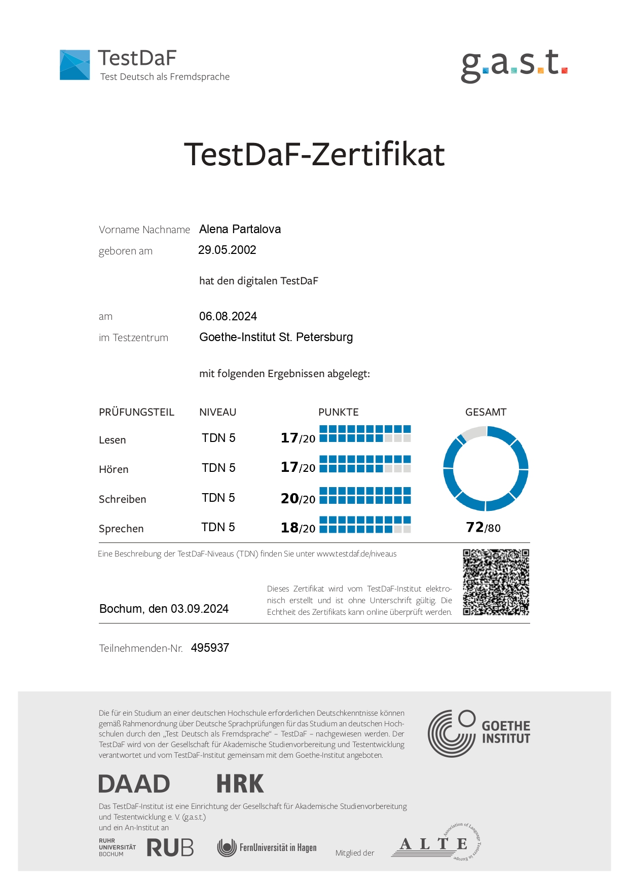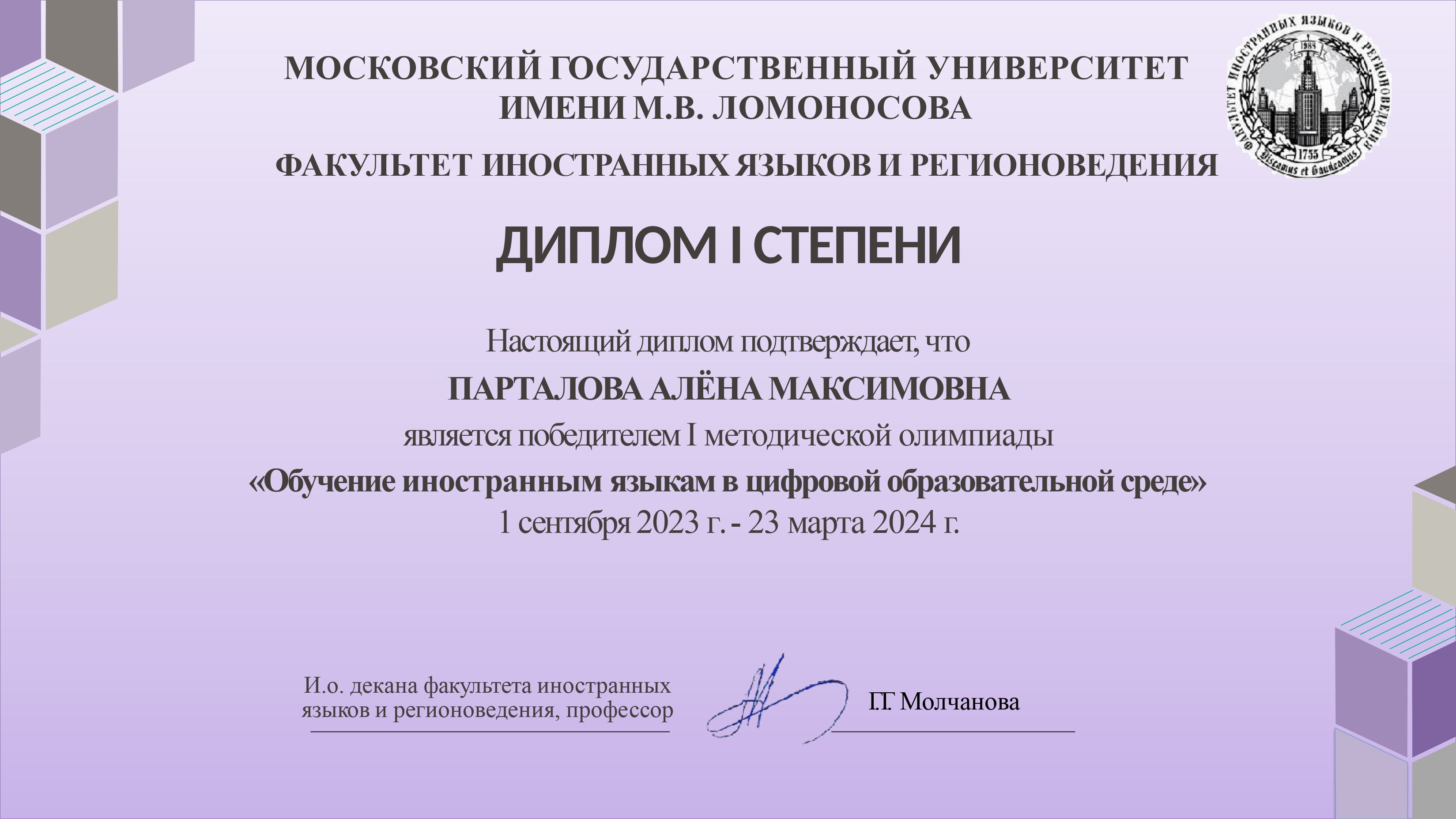 Дополнительная информация: Уровень немецкого C1.2 (TestDaF 5555). Практическая подготовка в школе с углубленным изучением немецкого языка. Победитель международных олимпиад по немецкому языку и методике преподавания иностранных языков. Участник Летних школ от МГУ, Йенского университета (Германия) и Утрехтского университета (Нидерланды). Переводчик на международных соревнованиях в Швейцарии.