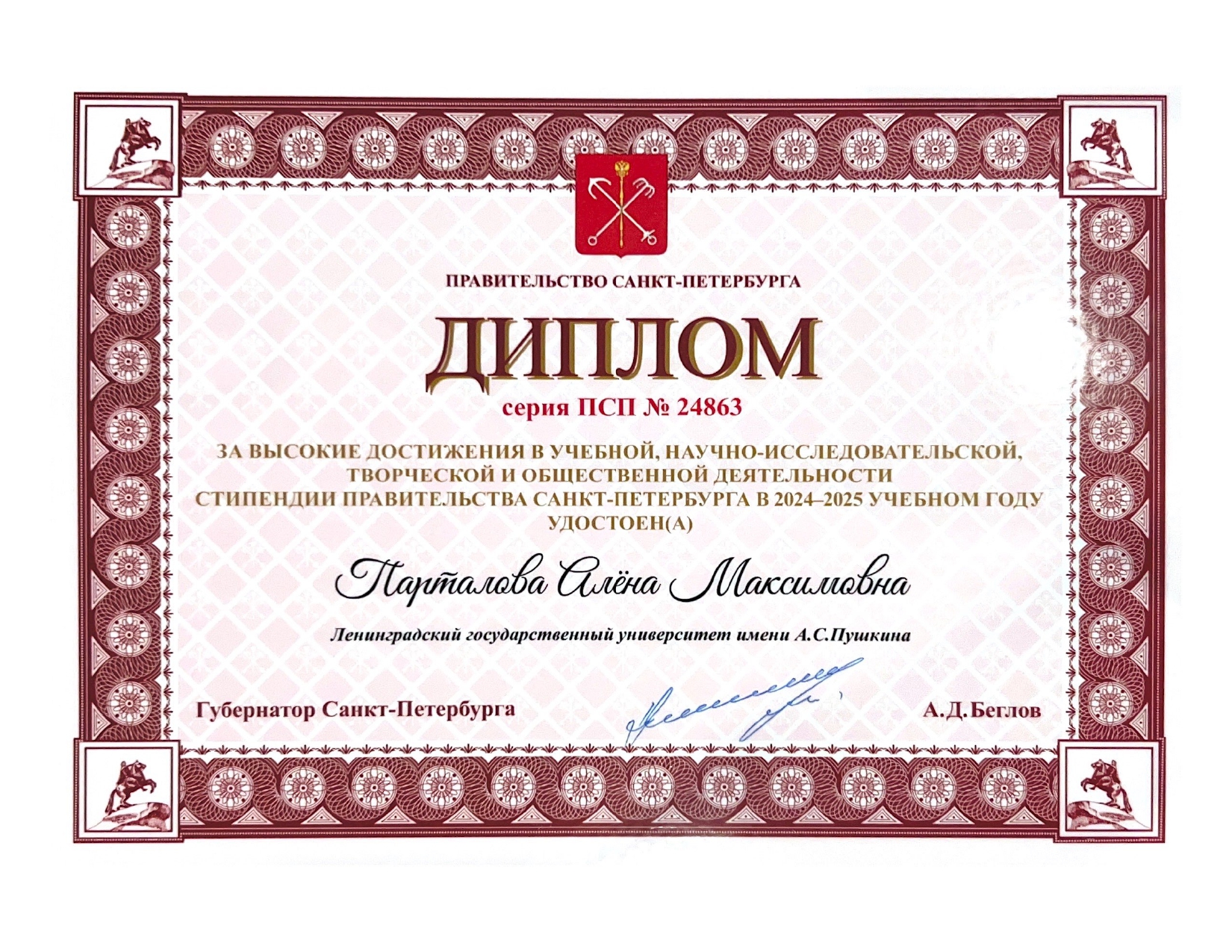 - Образование: ЛГУ имени А.С. Пушкина, педагогическое образование с двумя профилями подготовки (английский язык и немецкий язык), бакалавр, 2025 год.