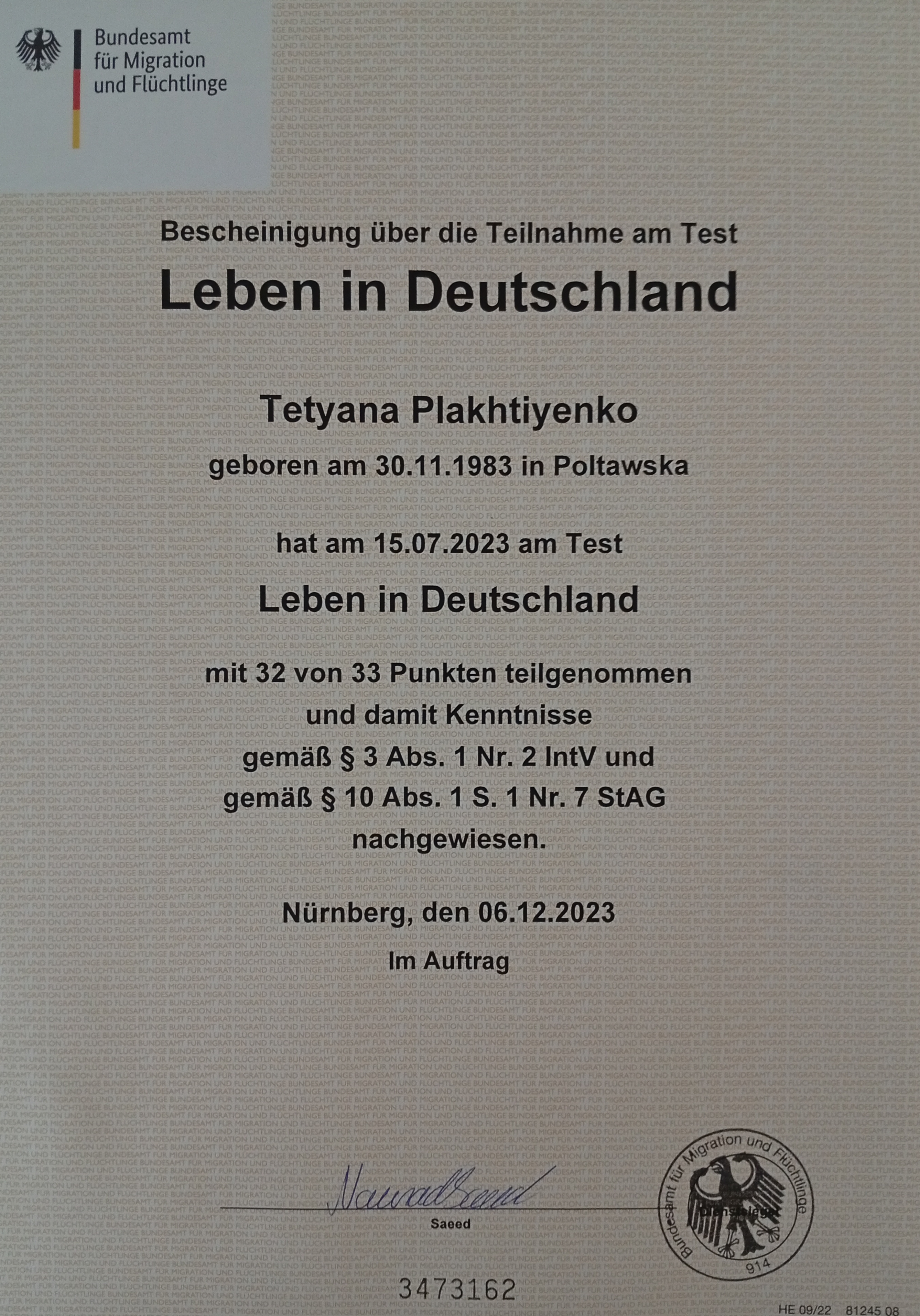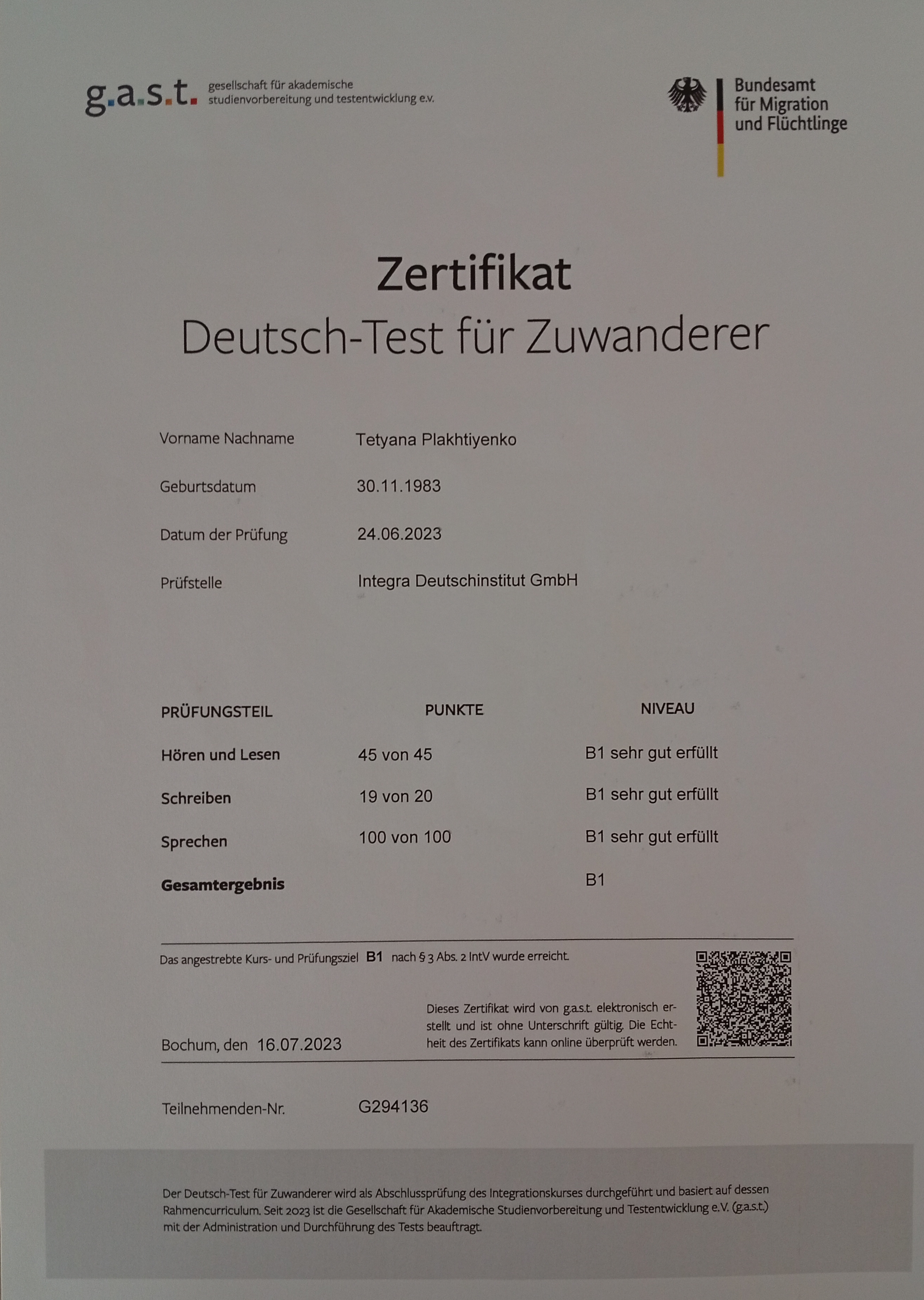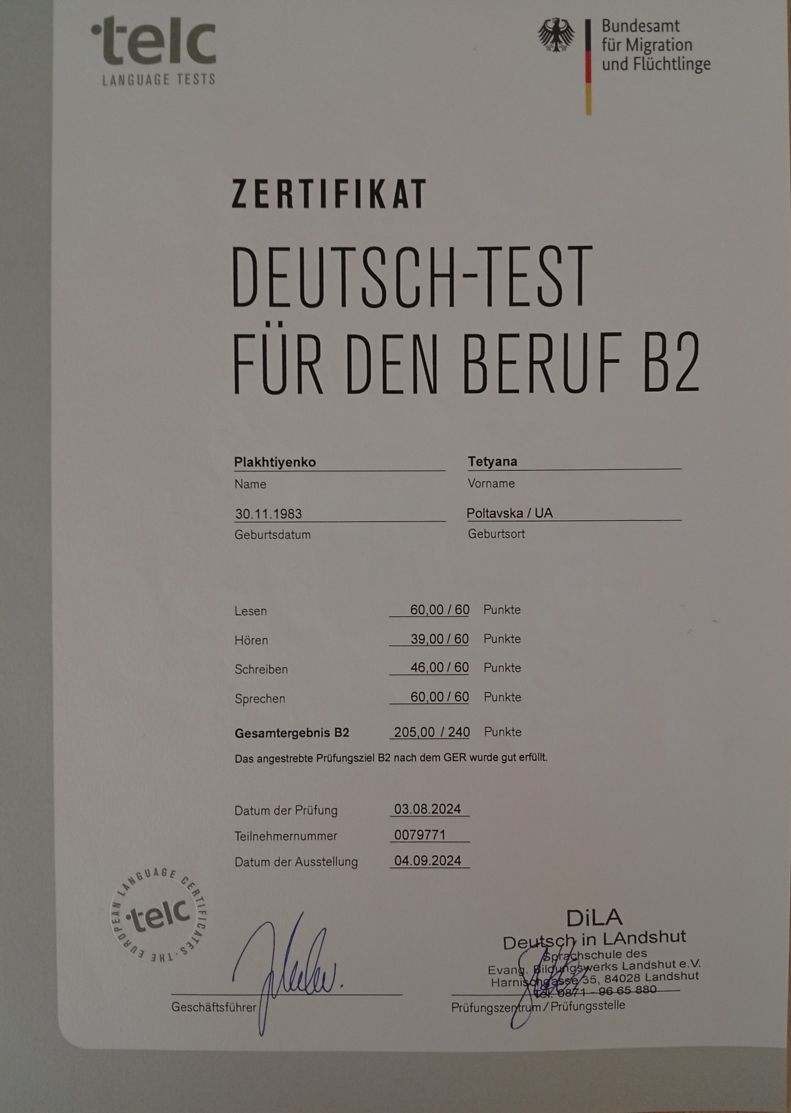 Обучение в Германии: языковая школа "Integra", Мюнхен, курс "Leben in Deutschland", 2024 год. Курсы немецкого языка "Integra", Мюнхен, экзамен на B 1, 2024 год. Языковая школа "DiLA", Ландсхут, Германия, уровни B2 - C 1, 2025 год....