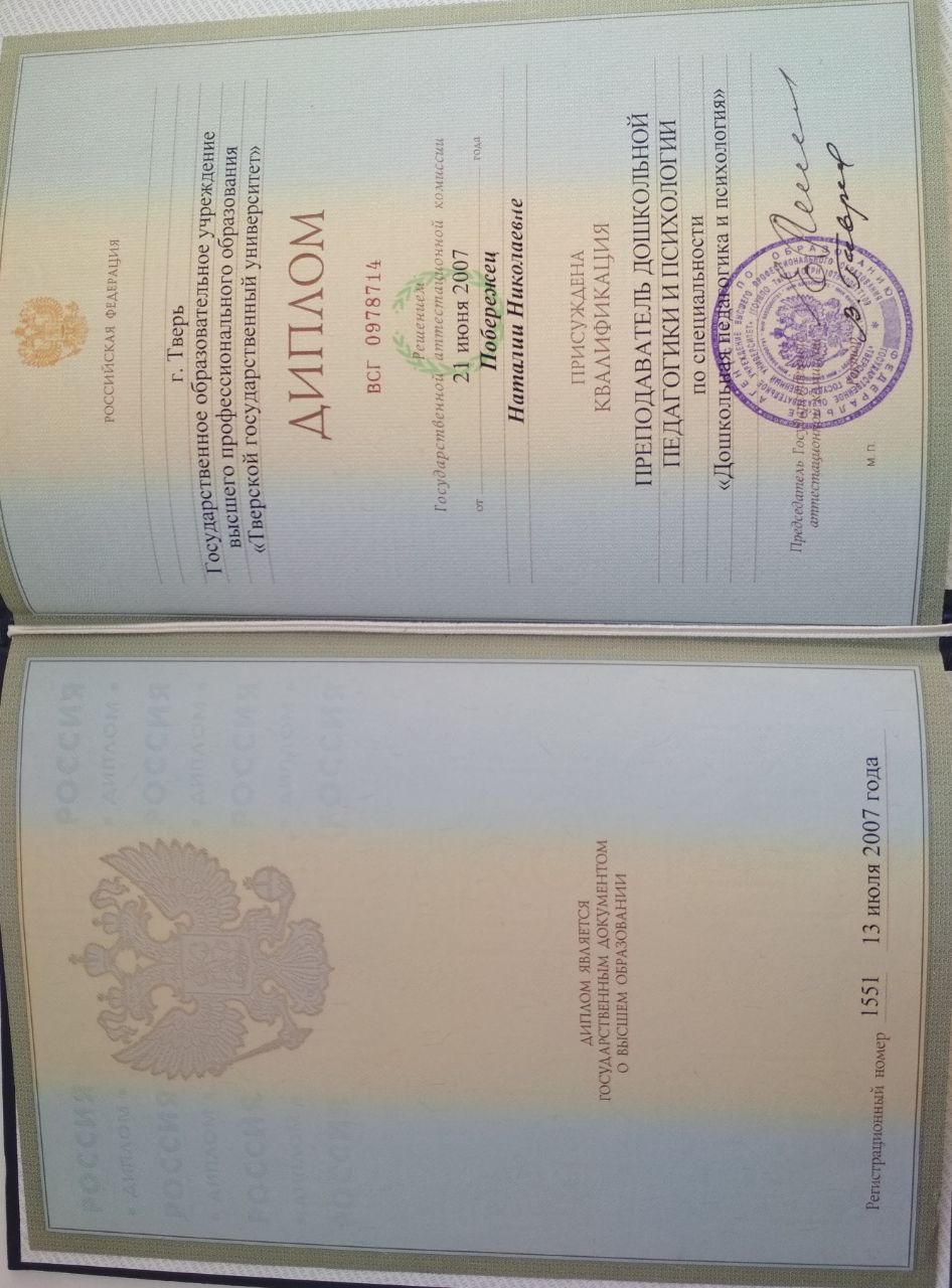 Образование: Высшее, Тверской Государственный Университет, дошкольная педагогика и психология, 2007 год.