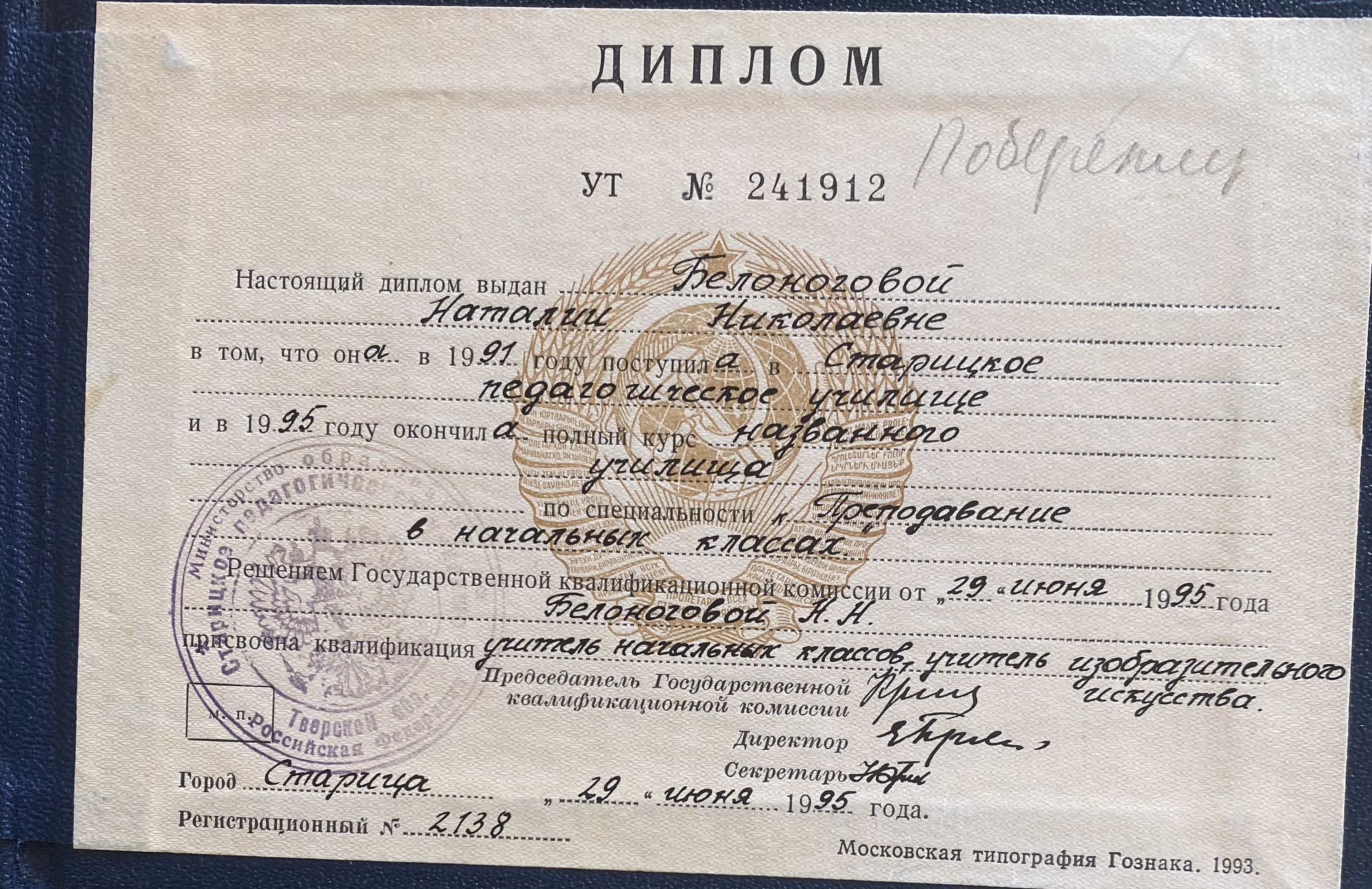 Старицкое Педагогическое Училище, учитель начальных классов, учитель ИЗО, 1995 год.