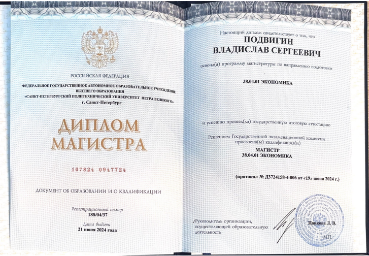 Высшее экономическое, Санкт-Петербургский Политехнический Университет Петра Великого, специальность «Экономика», магистр, 2024 год.