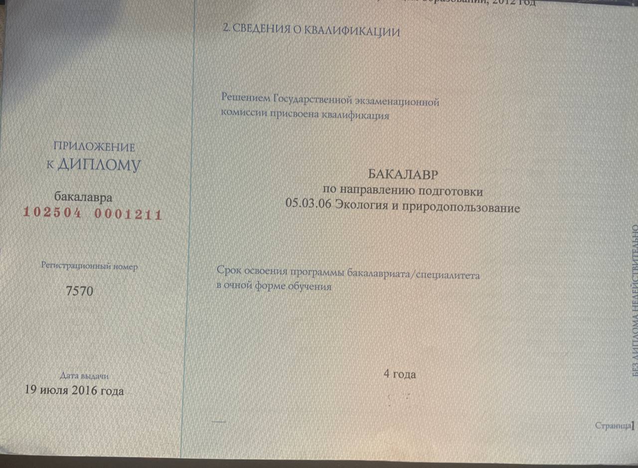 - Образование: Высшее, бакалавр, Владивостокский Государственный Университет Экономики и Сервиса, инженер-эколог, 2016 год.