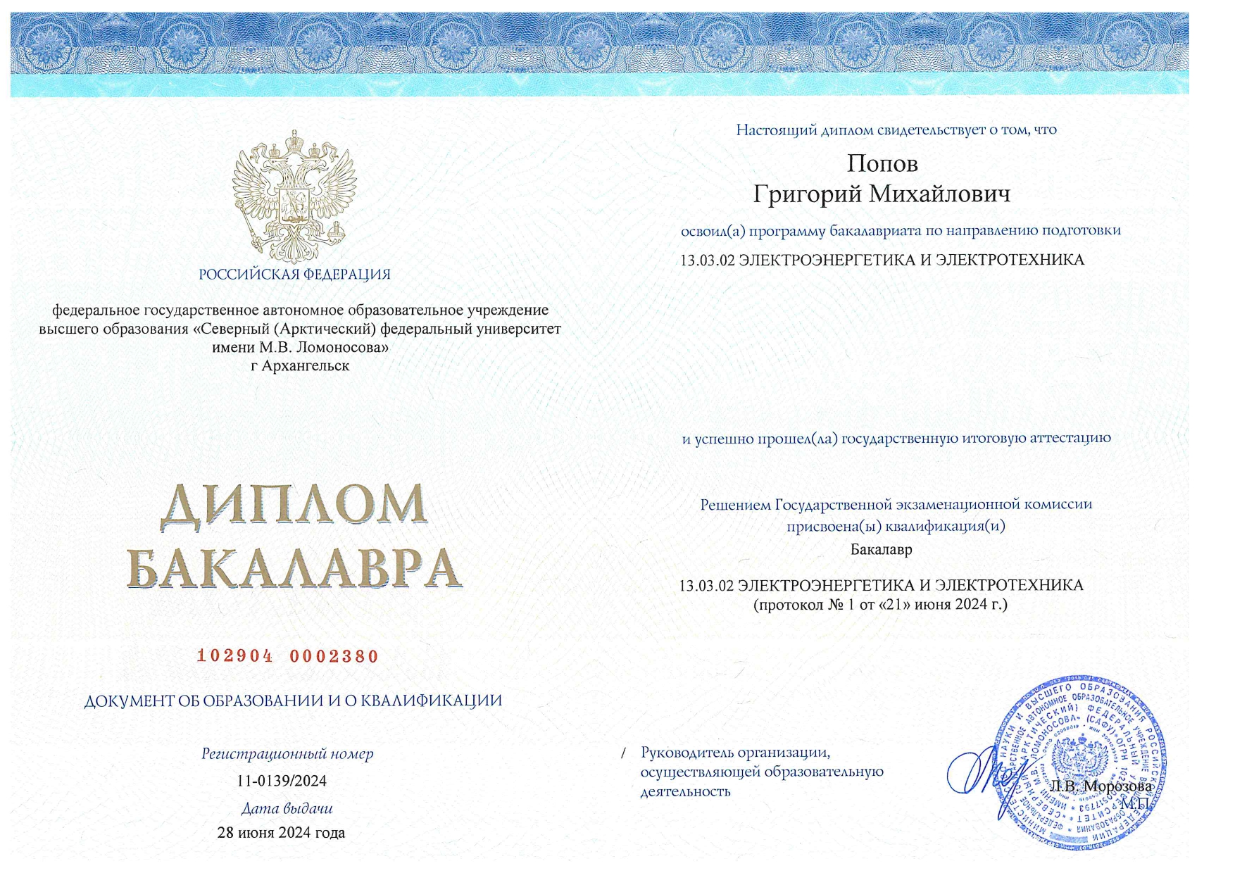 - Образование: Северный (Арктический) Федеральный Университет имени М. В. Ломоносова, электроэнергетика и электротехника, бакалавр, 2024 год.