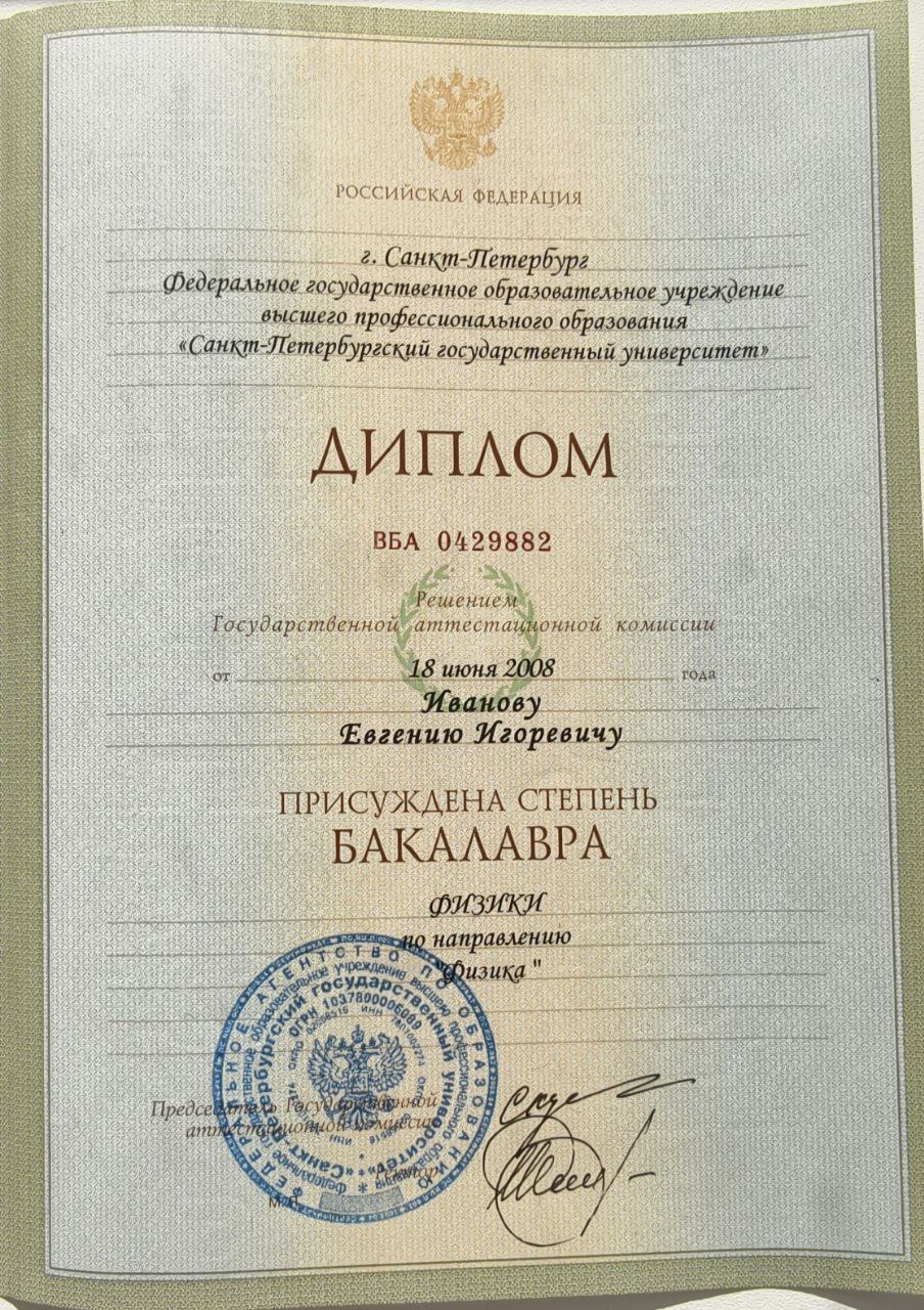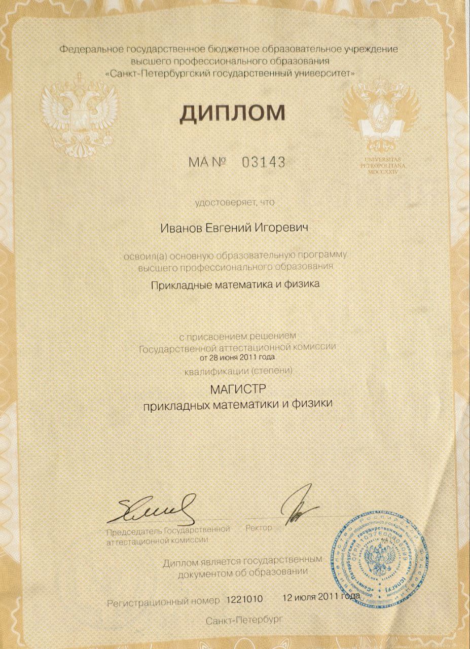 - Образование: 1)СПбГУ, физический факультет, бакалавр физики (2008 г.); 2)СПбГУ, ПМ-ПУ, магистр прикладной математики и физики (2011 г.).