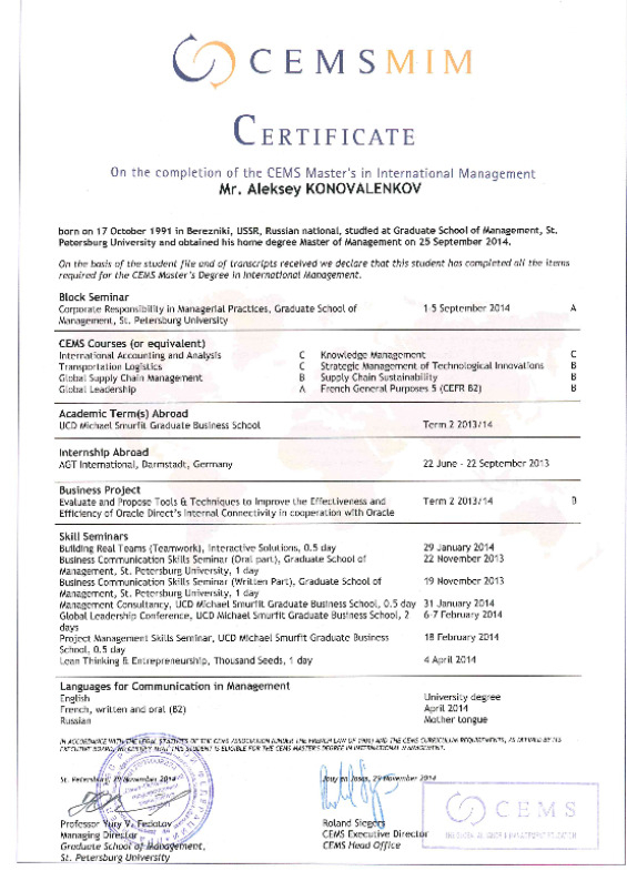 2012 - 2014 гг.: Санкт - Петербургский Государственный Университет, Высшая Школа Менеджмента, магистратура, программа Master in International Business, + CEMS Master in International Management (entirely in English)