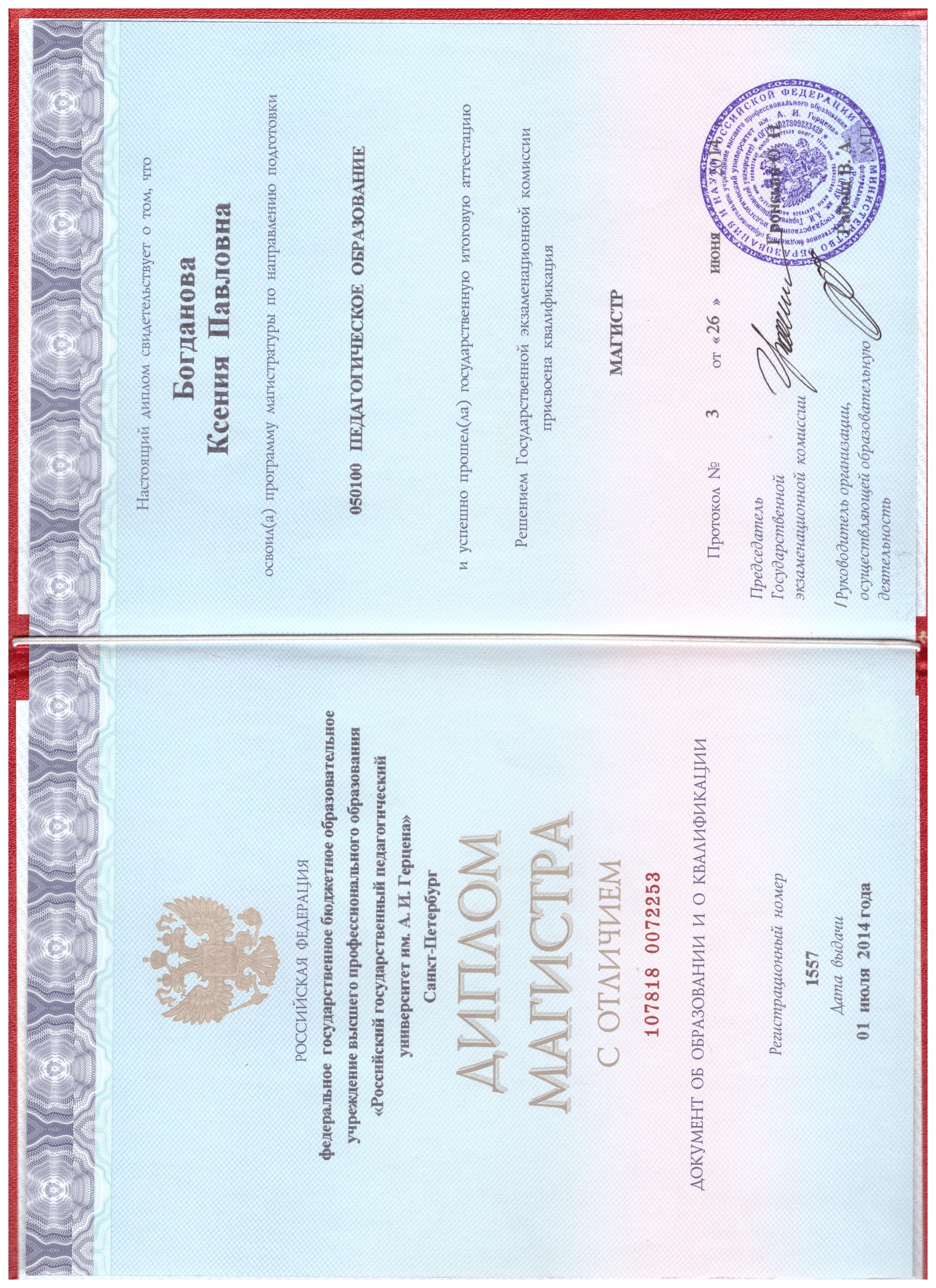 - Образование: Магистр педагогического образования (РГПУ им. А. И. Герцена, факультет иностранных языков, кафедра немецкой филологии)